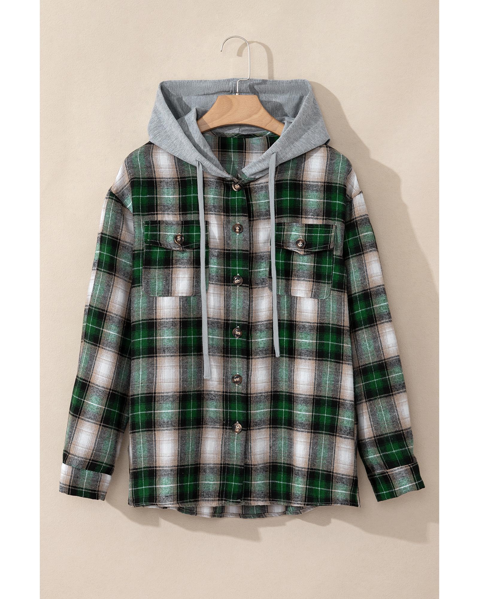 This green plaid print shacket features a versatile design that combines the style of a shirt and a jacket, making it suitable for various casual occasions. It includes practical details such as a chest pocket with a button closure and a hood for added comfort and functionality. Designed with a trendy fitted look, it is available in multiple sizes to fit different preferences and is suitable for all genders.