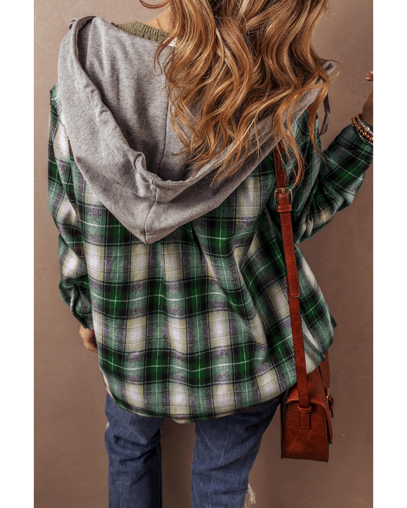 Green Plaid Print Chest Pocket Buttoned Hooded Shacket – XL