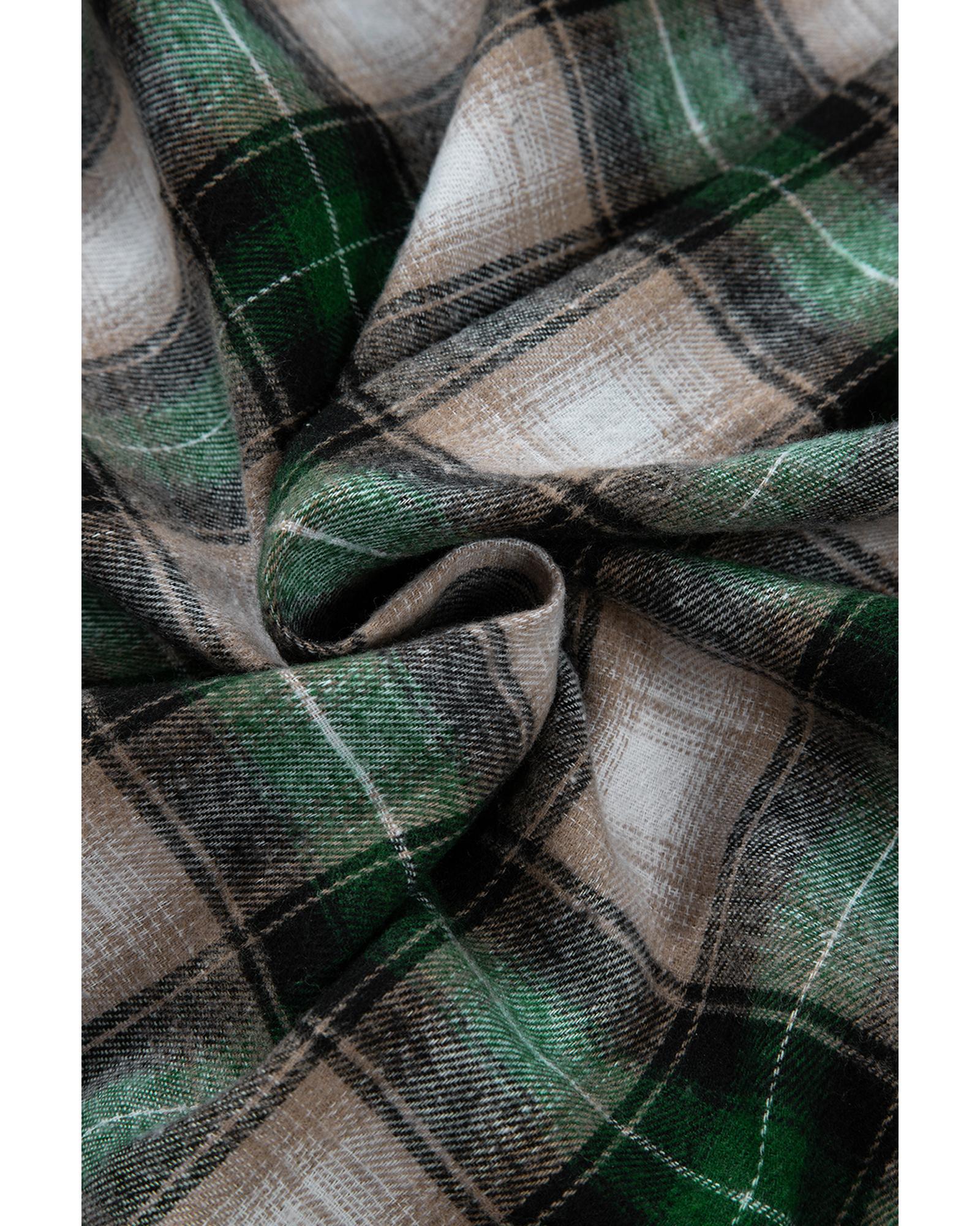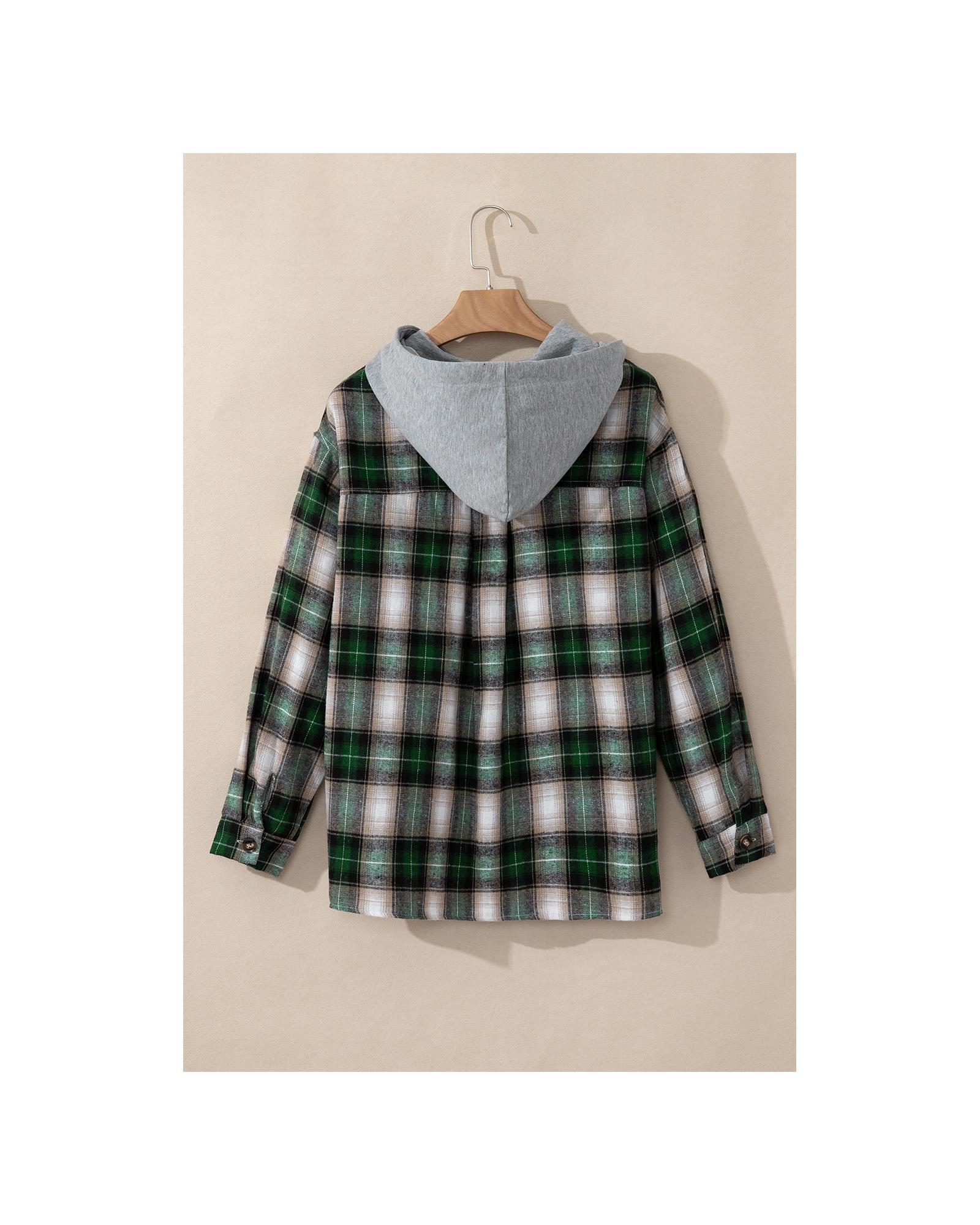 This green plaid print shacket features a versatile design that combines the style of a shirt and a jacket, making it suitable for various casual occasions. It includes practical details such as a chest pocket with a button closure and a hood for added comfort and functionality. Designed with a trendy fitted look, it is available in multiple sizes to fit different preferences and is suitable for all genders.