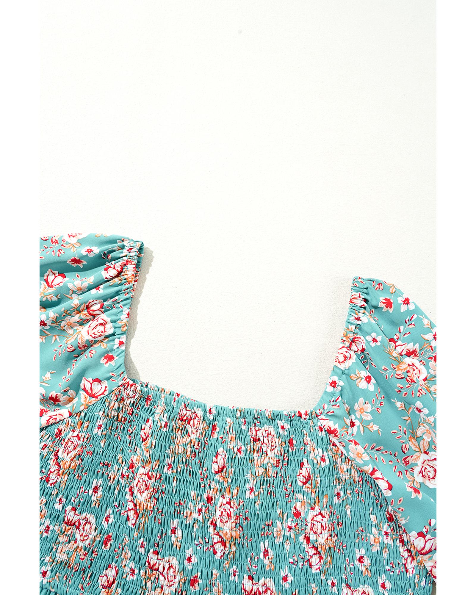 This plus size floral print maxi dress features a stylish square neckline and intricate smocked detailing, combining comfort with a trendy fitted silhouette. Designed to flatter curves, it is perfect for various occasions and offers a fashionable look with a comfortable fit.