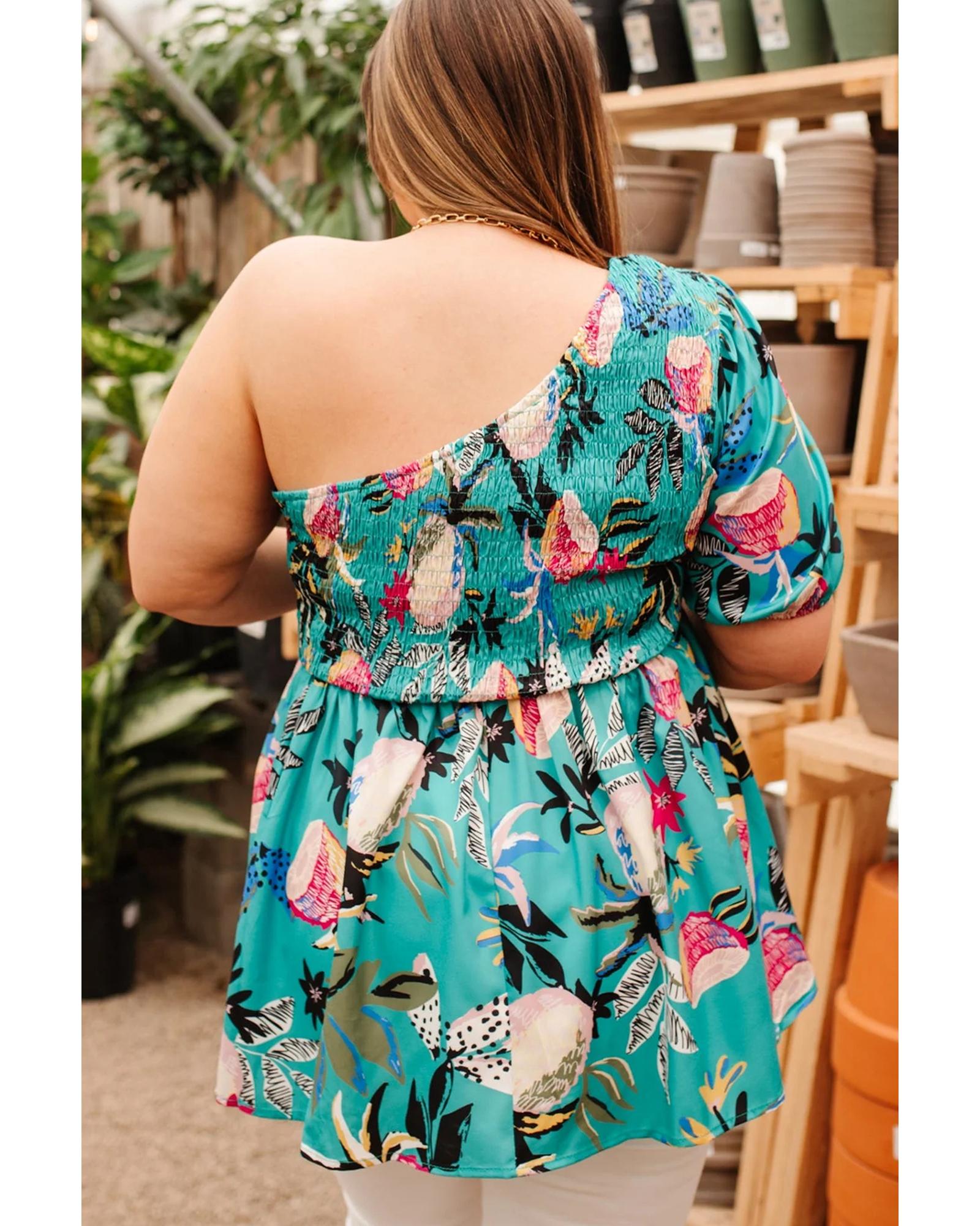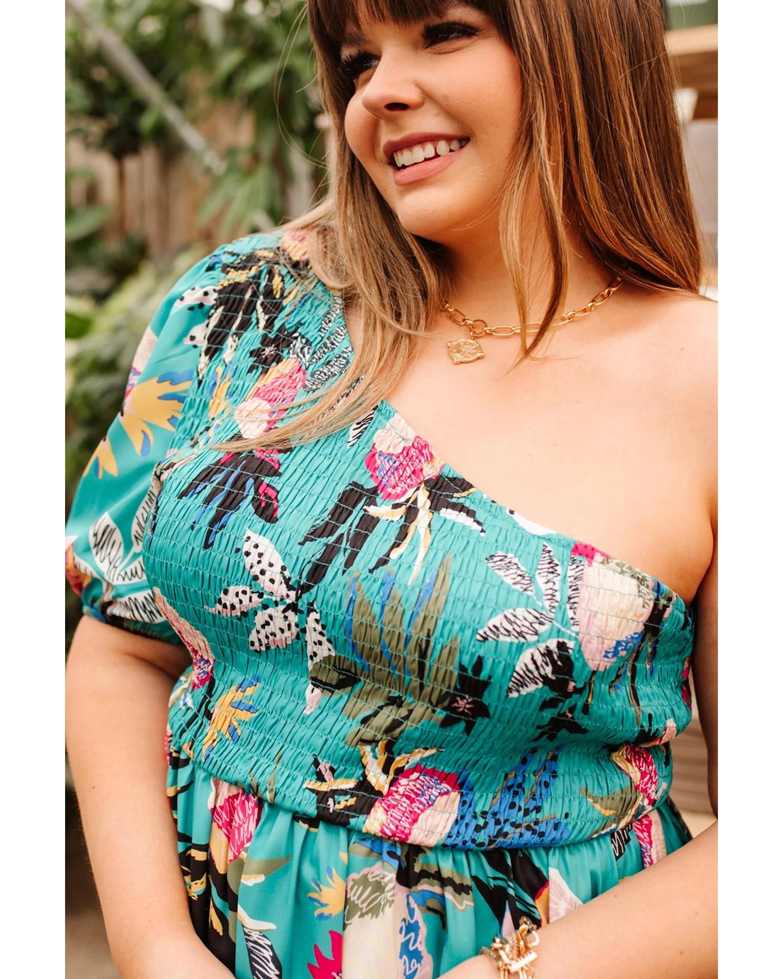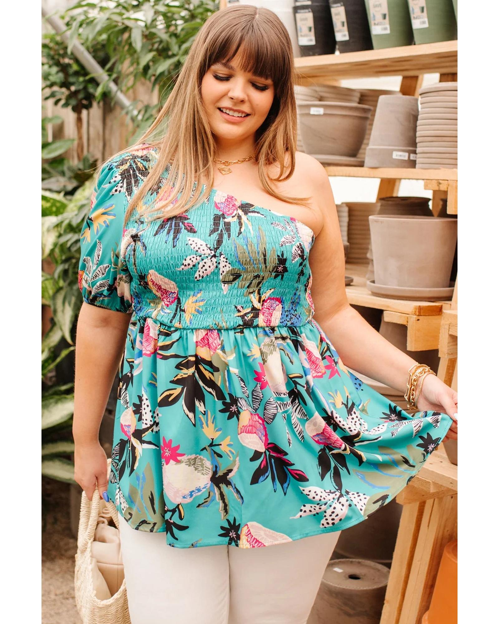 Green Plus Size Floral Smocked Bodice Single Puff Short Sleeve Babydoll Blouse – 4X