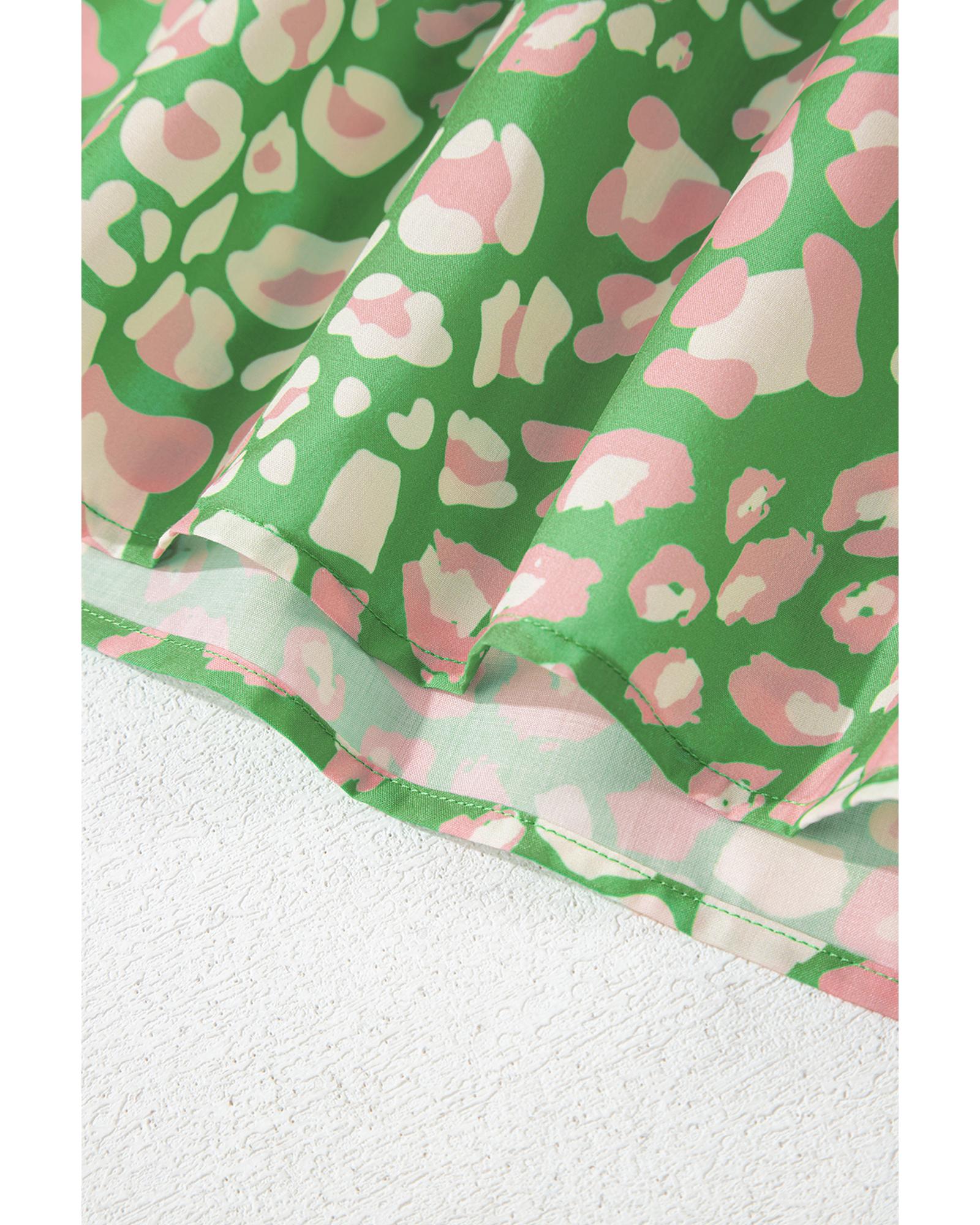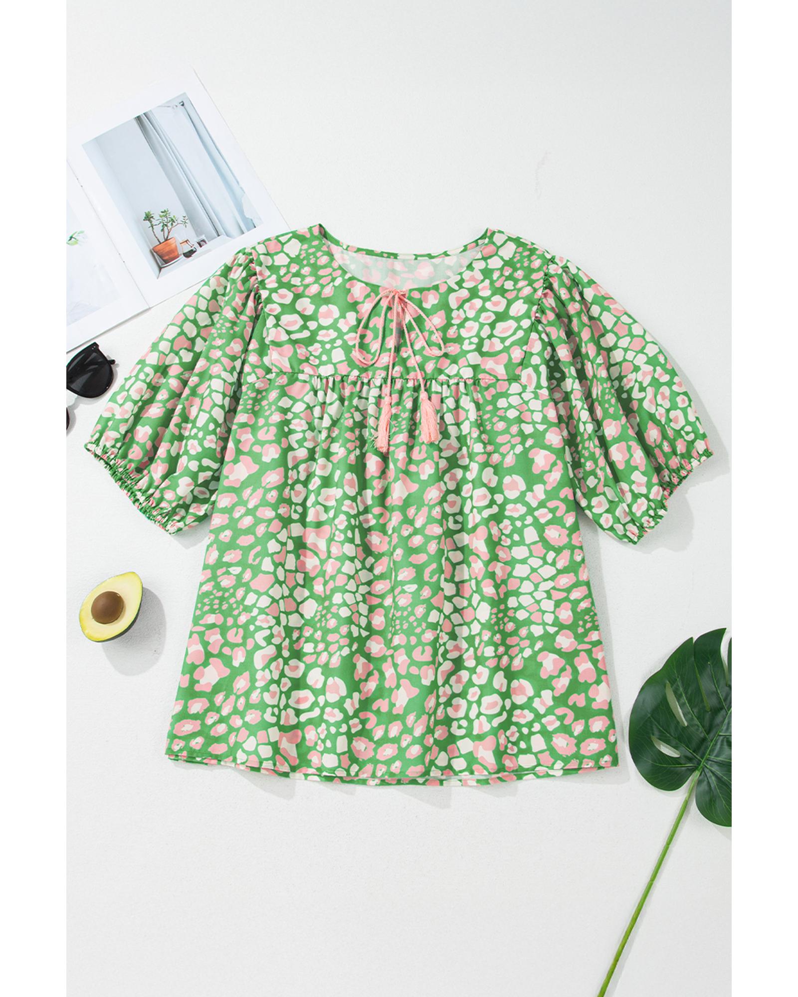 This plus size floral blouse features a vibrant green color with a delicate floral pattern. It is designed with a flattering split neck and tassel ties, complemented by puff sleeves that add a feminine touch. This versatile piece can be styled easily with jeans or a skirt for various occasions.
