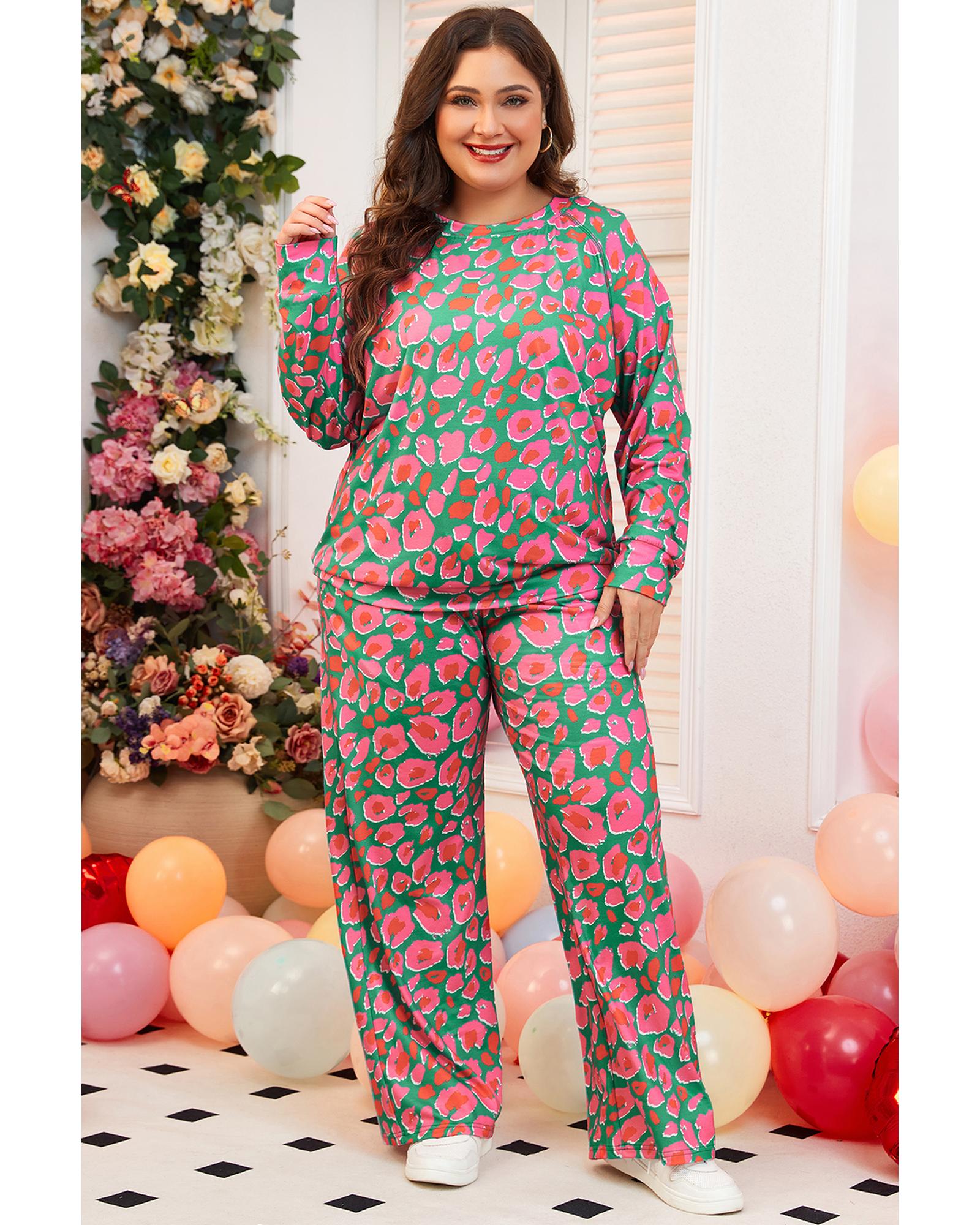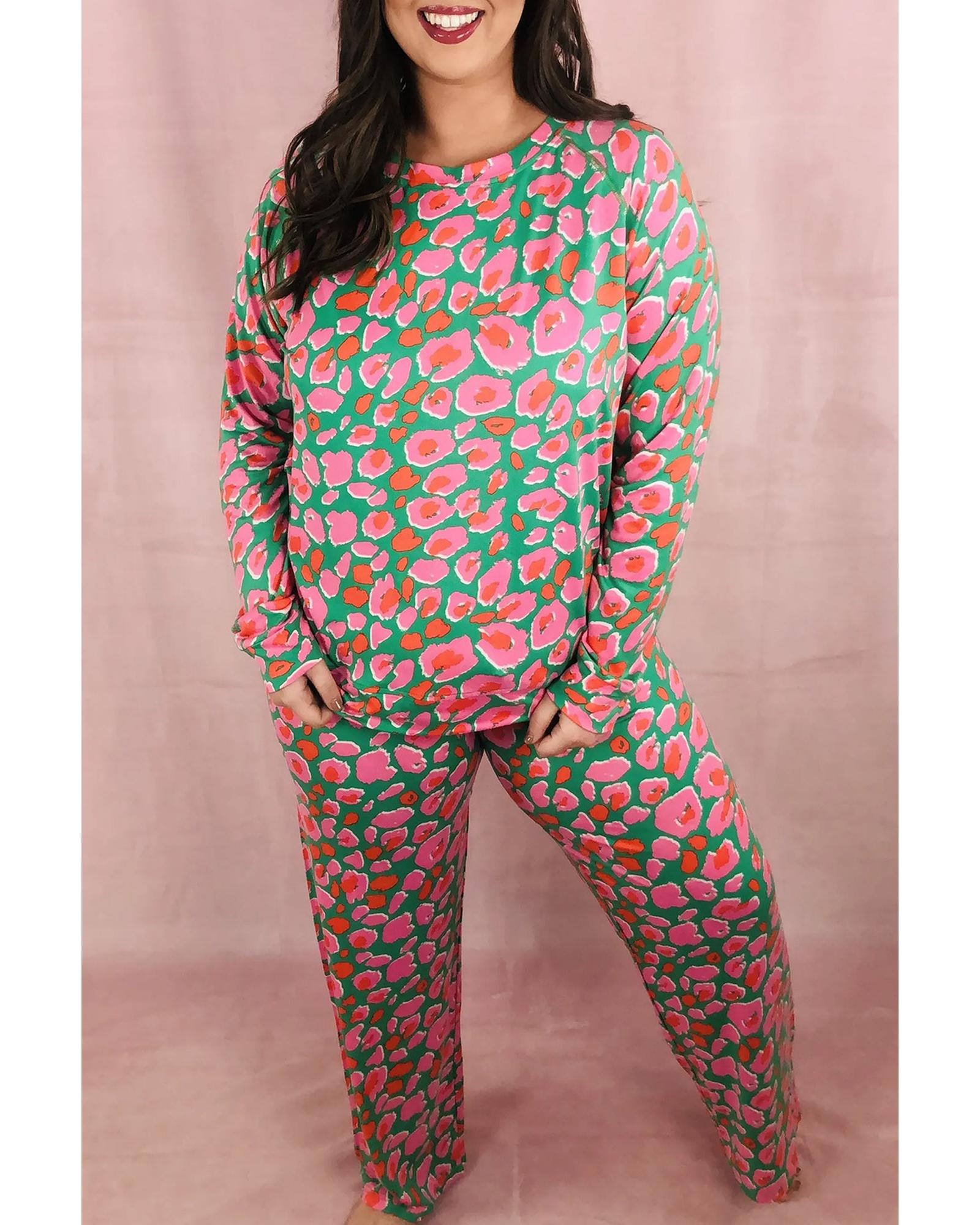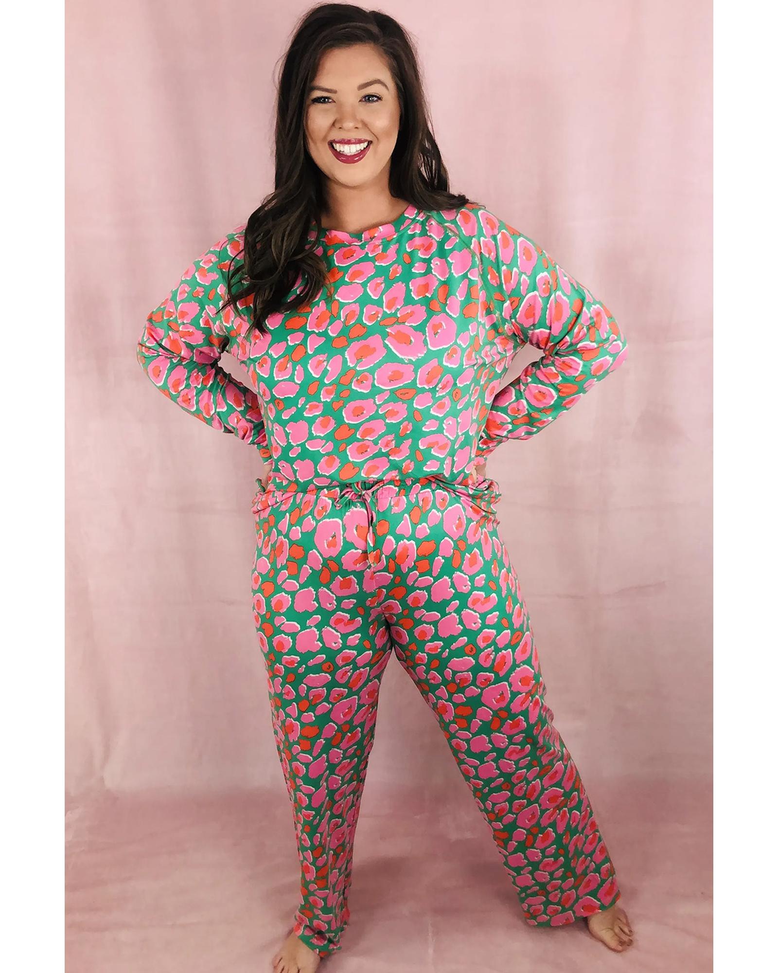 Green Plus Size Printed Long Sleeve and Pants Lounge Set – 1X