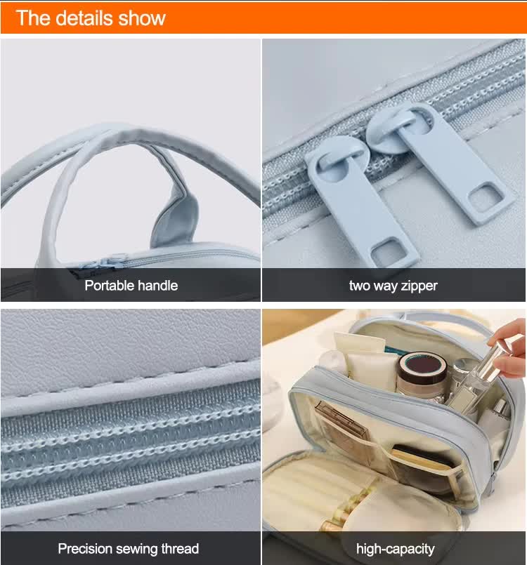 This large-capacity, waterproof makeup bag is designed for both short trips and extended travel. Made with soft PU leather, it offers a luxurious feel while providing durability and water resistance. The bag features multiple compartments to help organize your essentials efficiently and adds an elegant touch to your travel accessories.