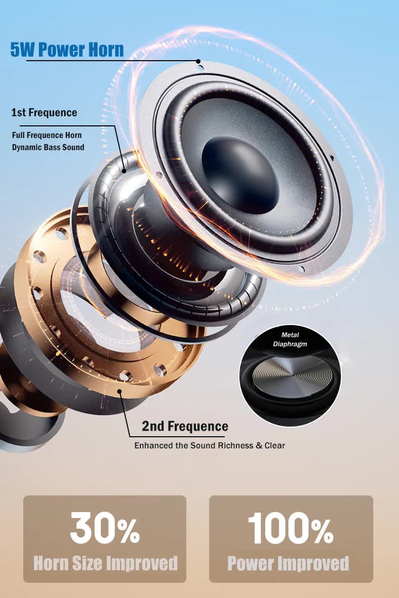 - 45mm, 5W speaker driver delivering clear, 360-degree stereo sound