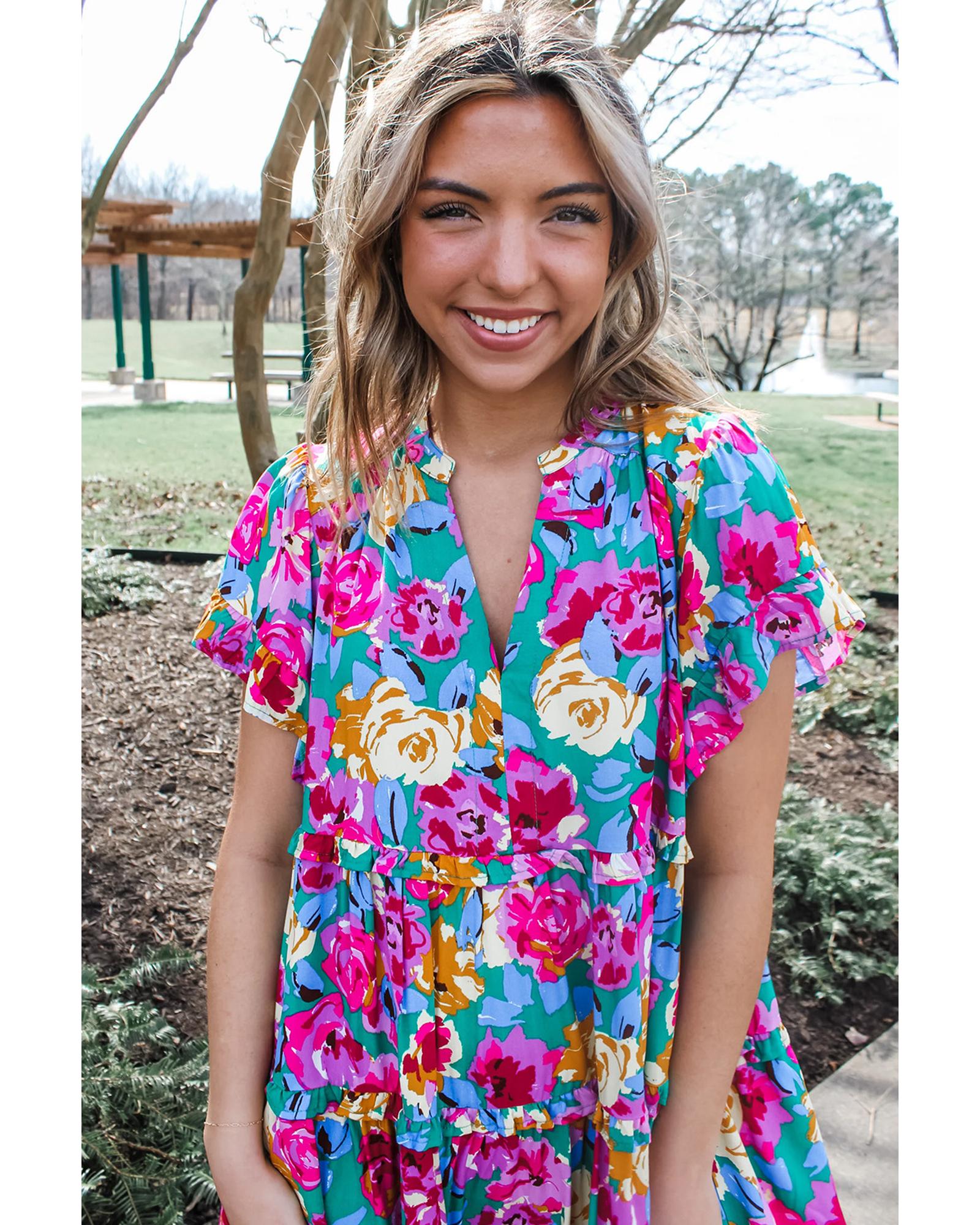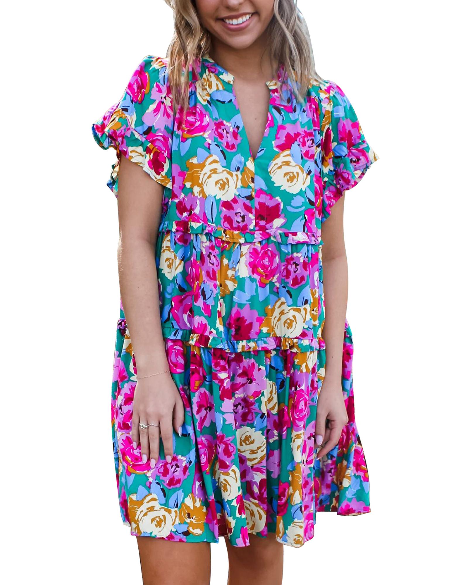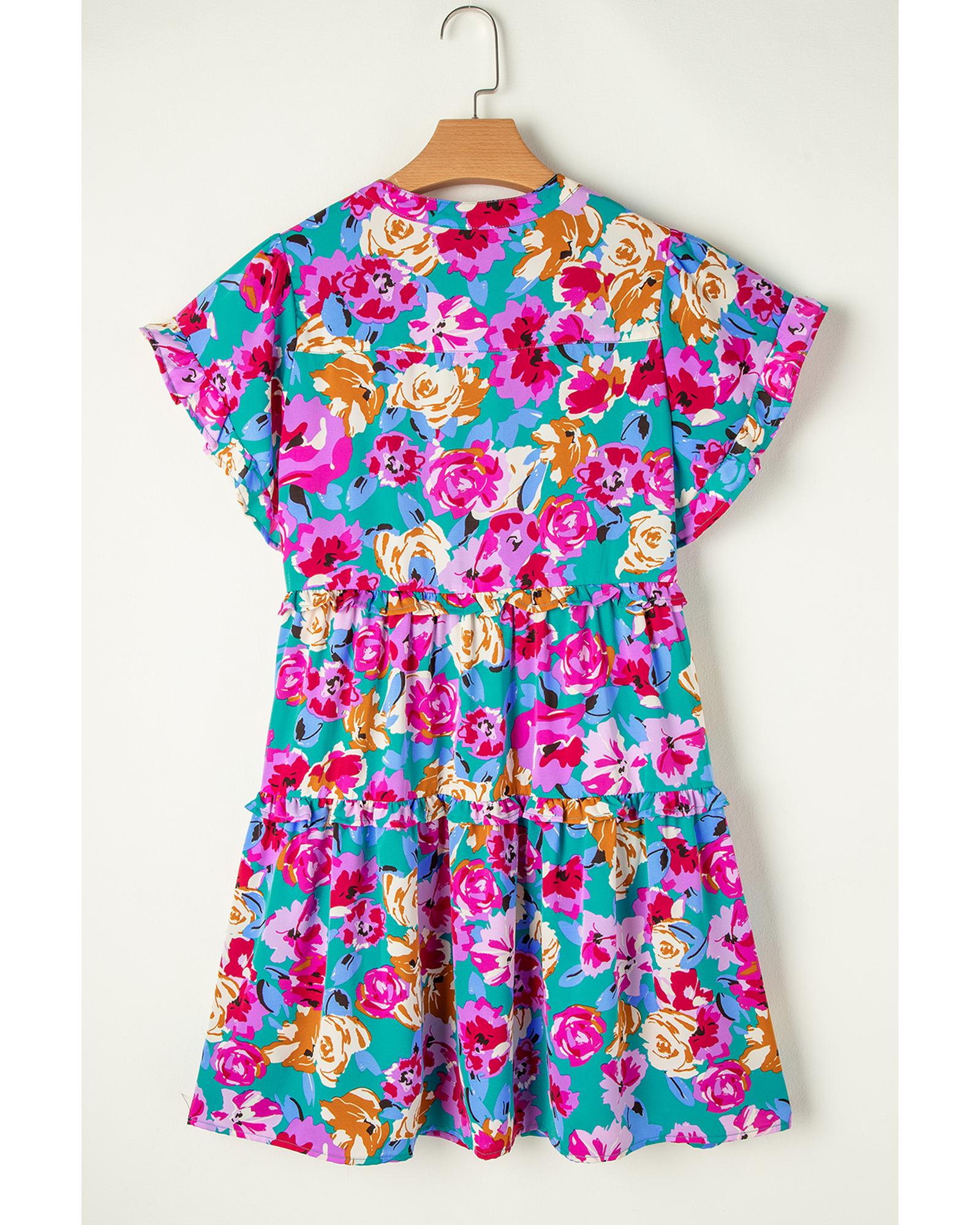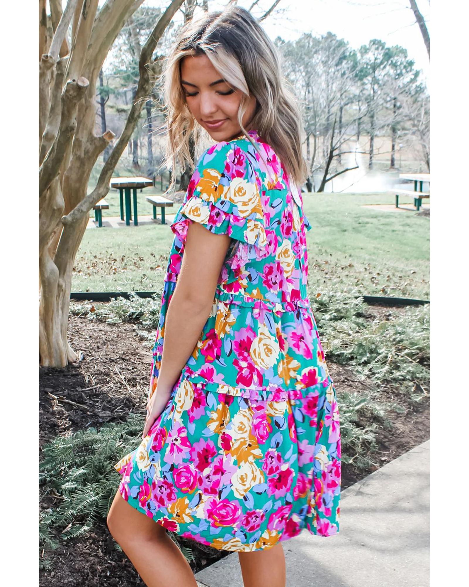 This floral print ruffled short dress combines feminine elegance with a trendy fitted silhouette. Designed for comfort and style, it features delicate rose patterns and charming ruffle details, making it suitable for both casual and semi-formal occasions.