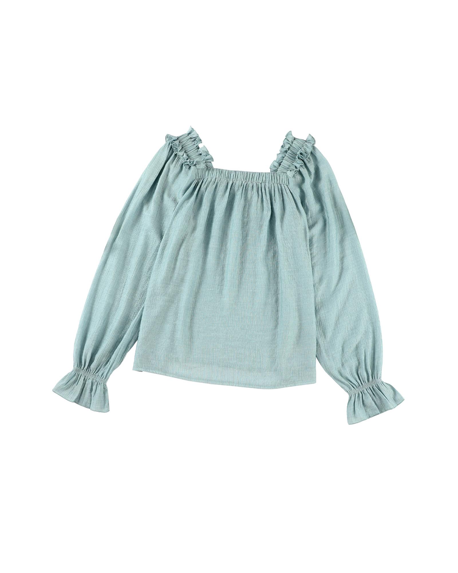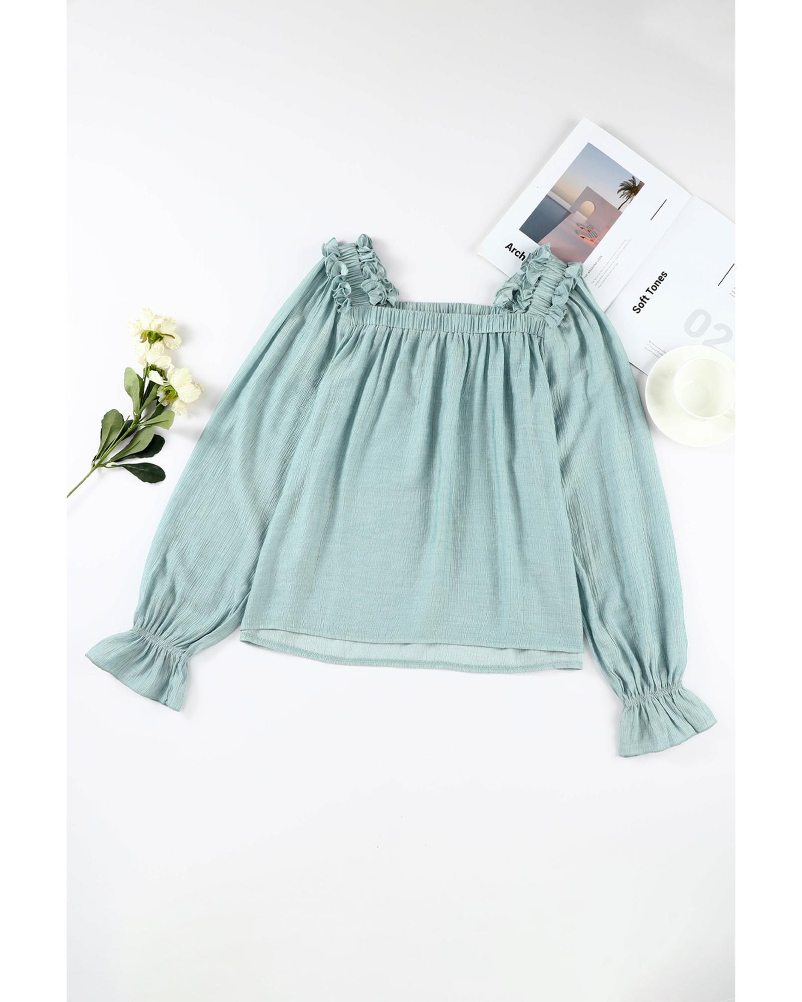 This stylish blouse features a square neckline with ruffled details and long sleeves, offering a trendy and fitted look. Made from soft, lightweight fabric with a crinkle texture, it combines comfort with fashionable design. The elastic neckline allows for easy wearing and off-the-shoulder styling, making it suitable for daily wear and versatile fashion occasions.