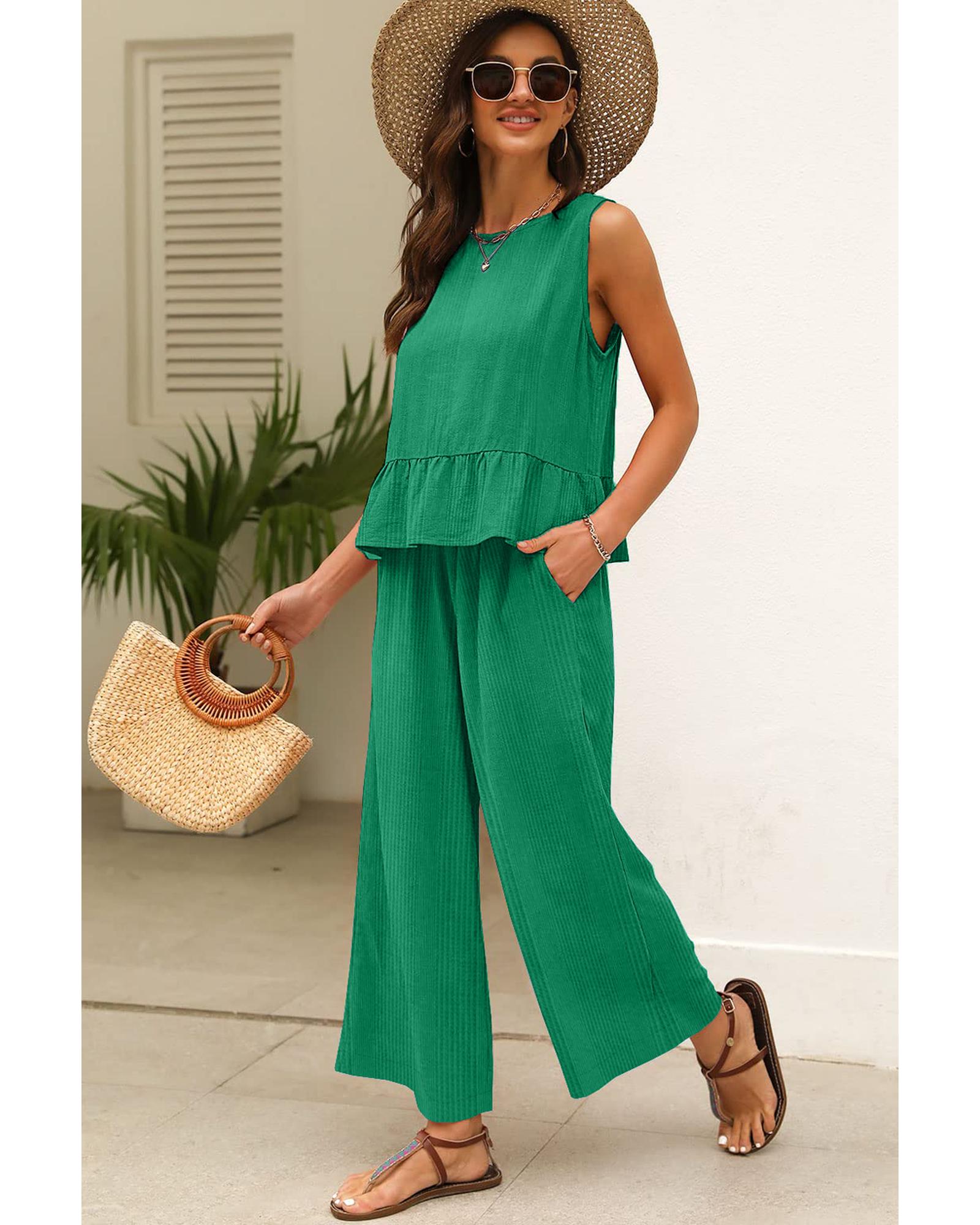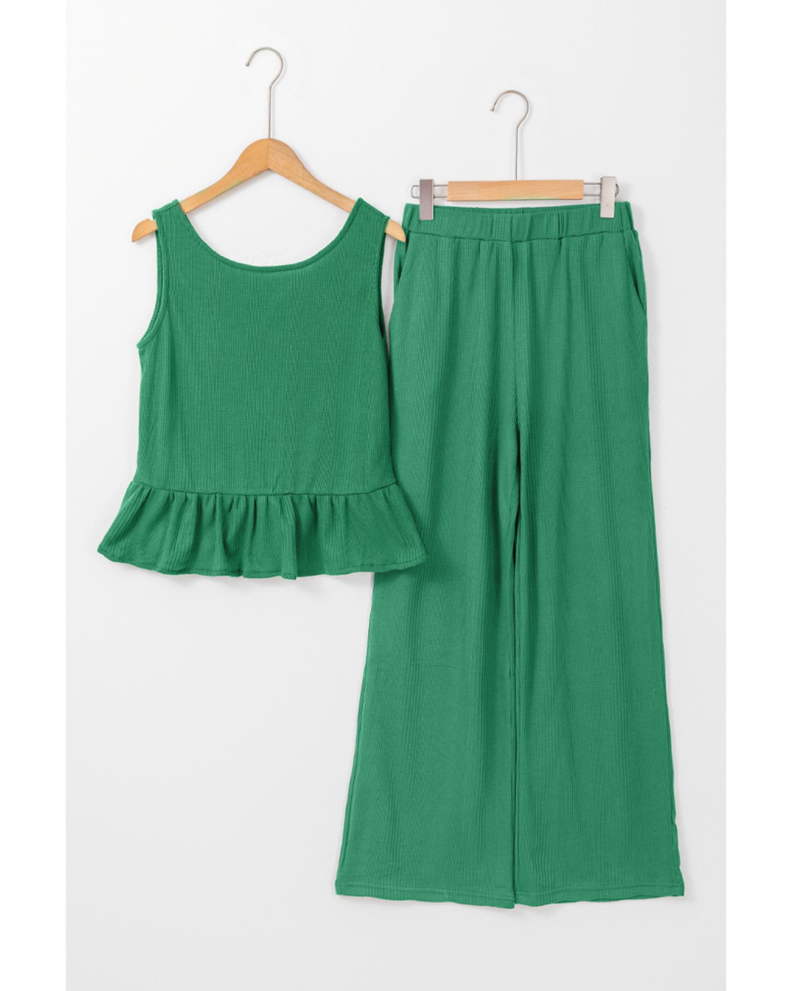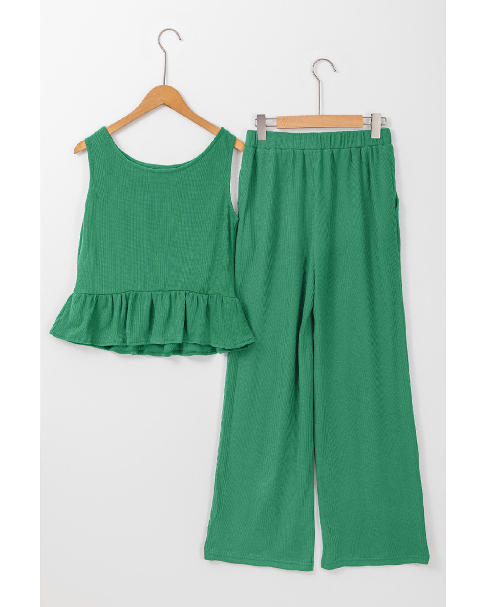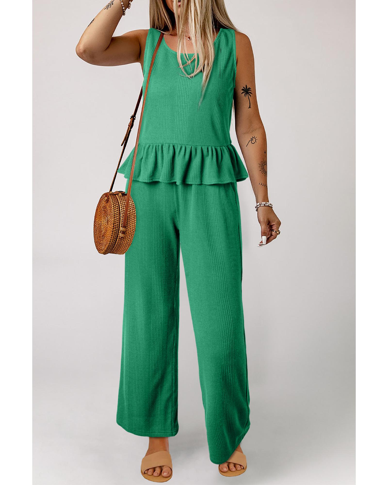 This green solid color ribbed ruffle tank top and pants set offers a stylish and comfortable loungewear option. The set features a ribbed texture that adds visual interest, along with a ruffled hem on the tank top for a feminine touch. Designed for ease of wear, the sleeveless tank top can be layered effortlessly, and the matching pants complete the look for a coordinated outfit.