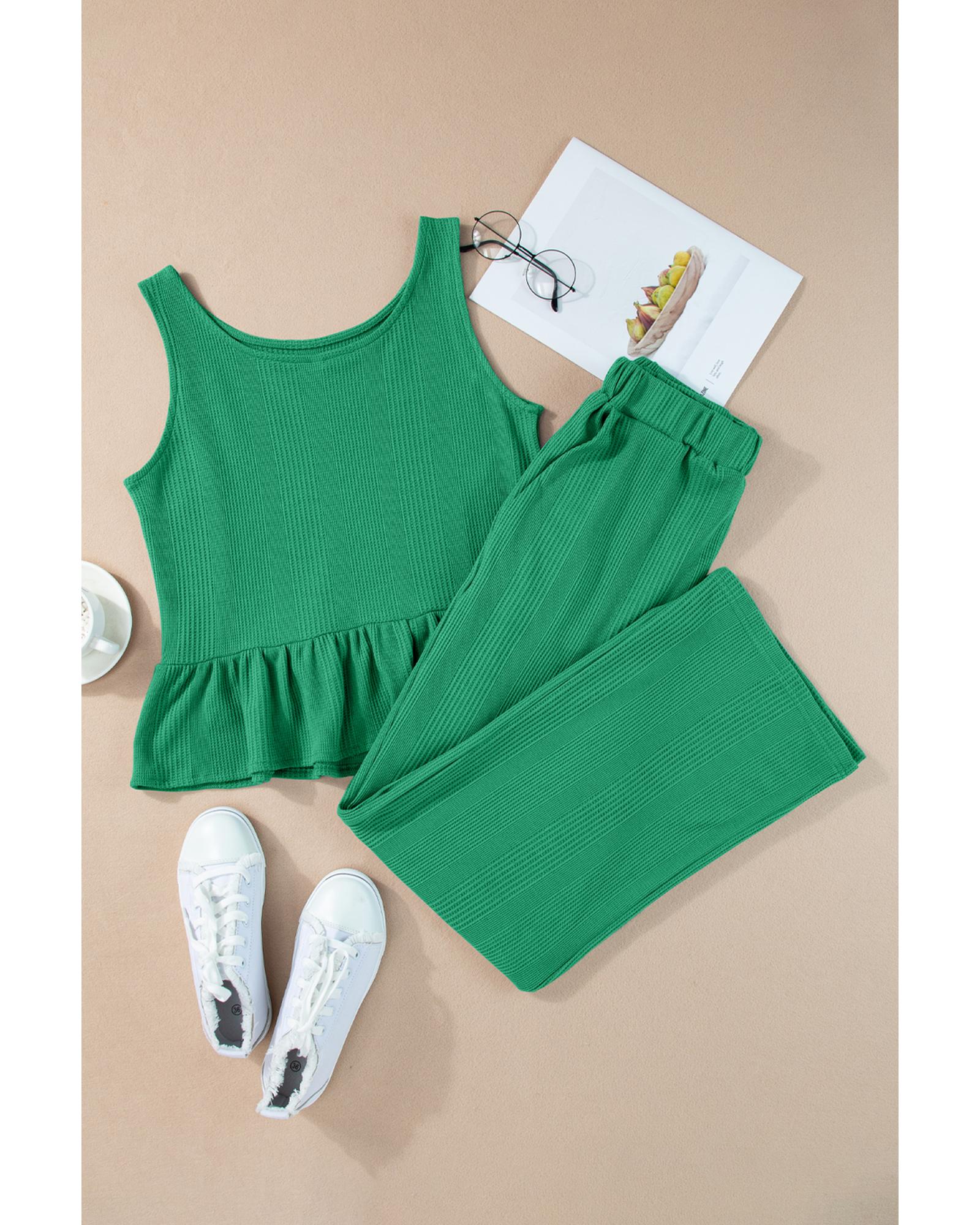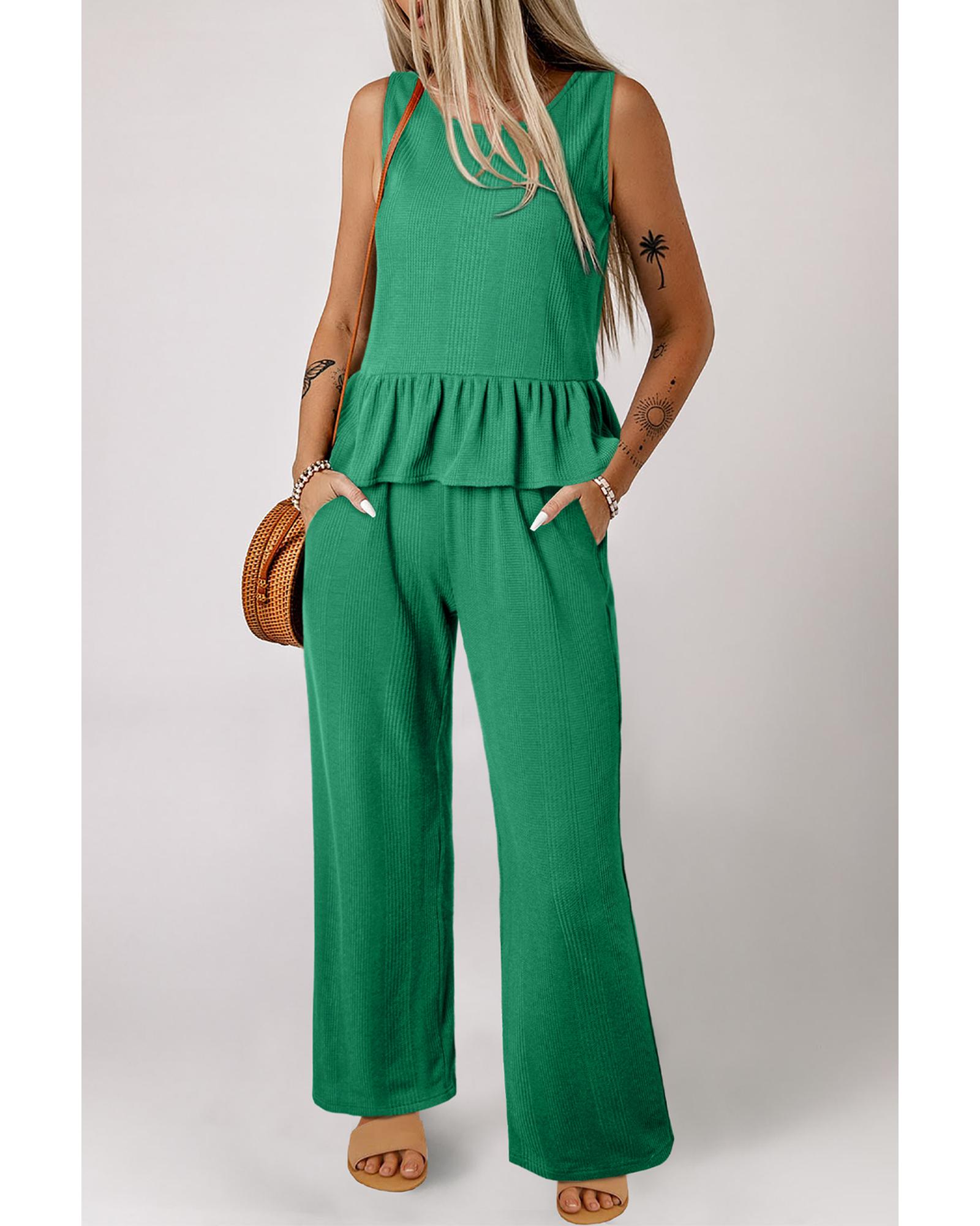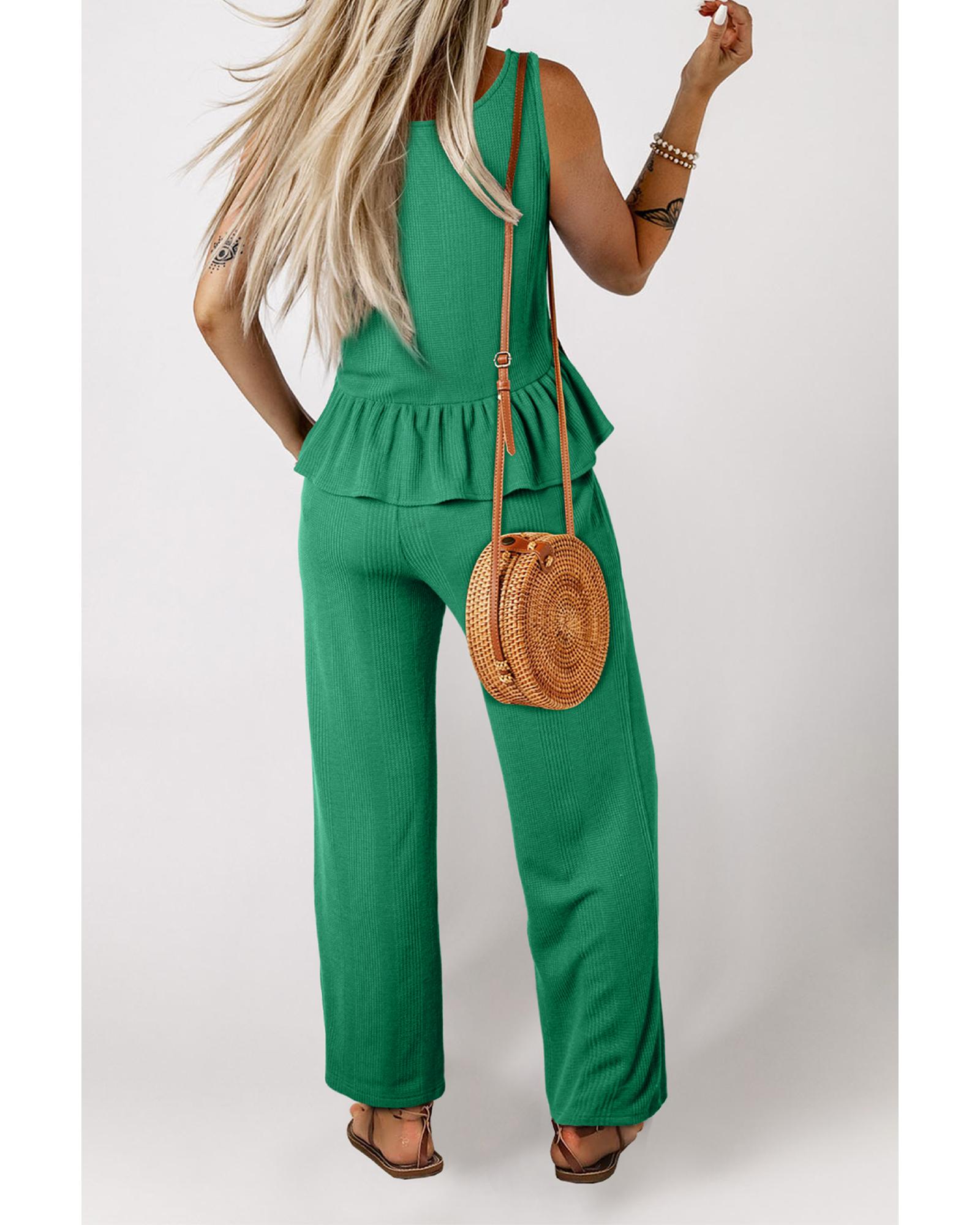This green solid color ribbed ruffle tank top and pants set offers a stylish and comfortable loungewear option. The set features a ribbed texture that adds visual interest, along with a ruffled hem on the tank top for a feminine touch. Designed for ease of wear, the sleeveless tank top can be layered effortlessly, and the matching pants complete the coordinated look.