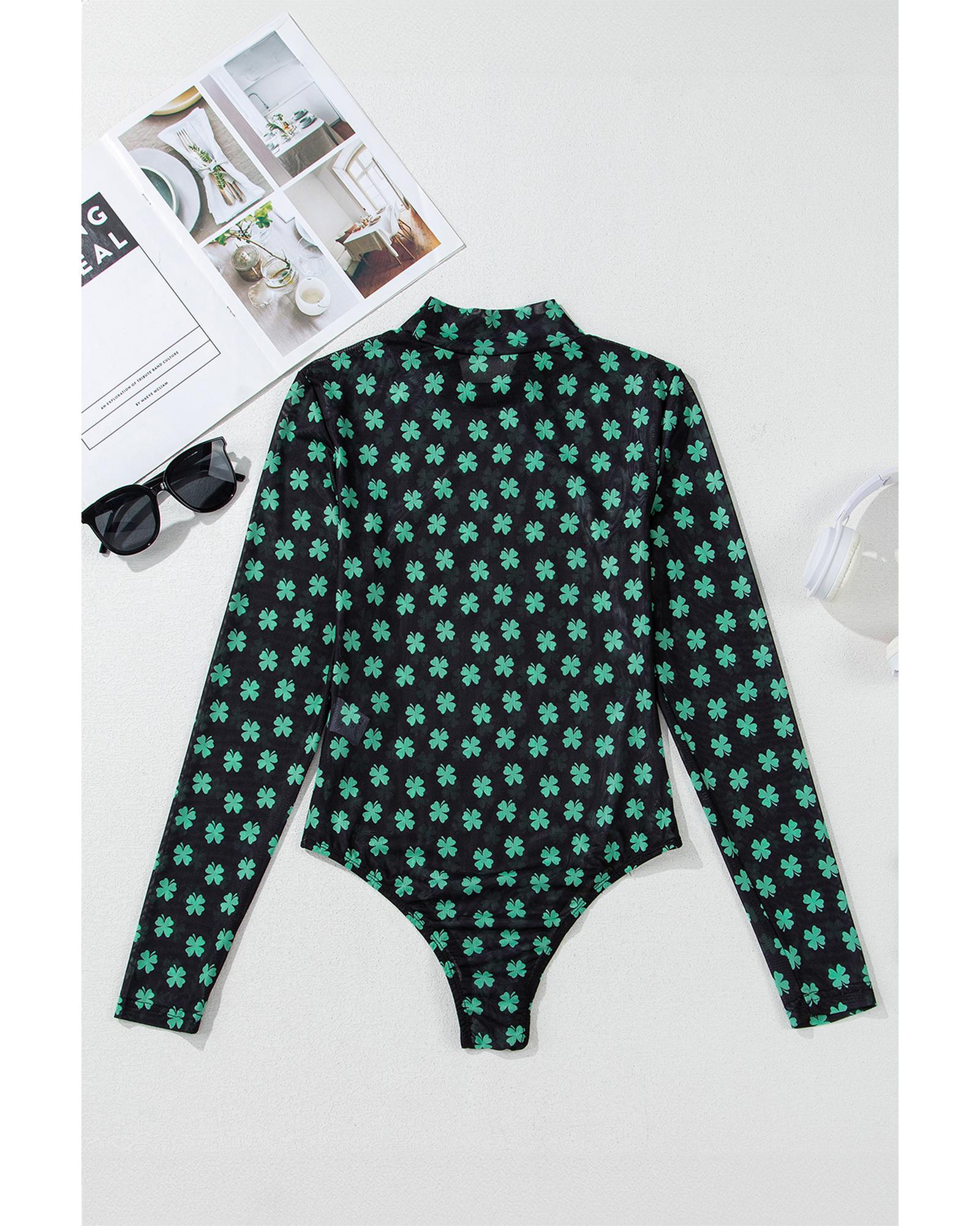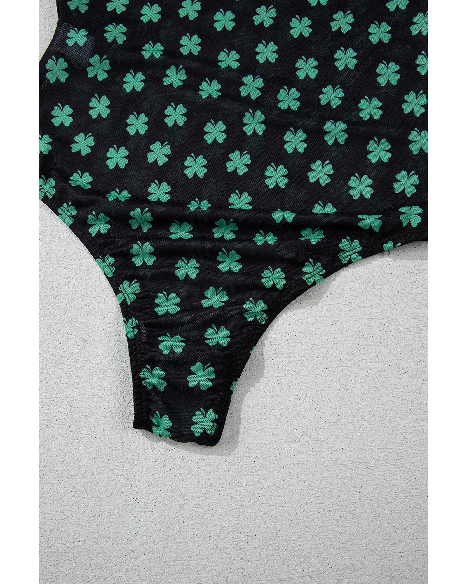 Green St Patrick Shamrock Printed Long Sleeve Mesh Bodysuit – M
