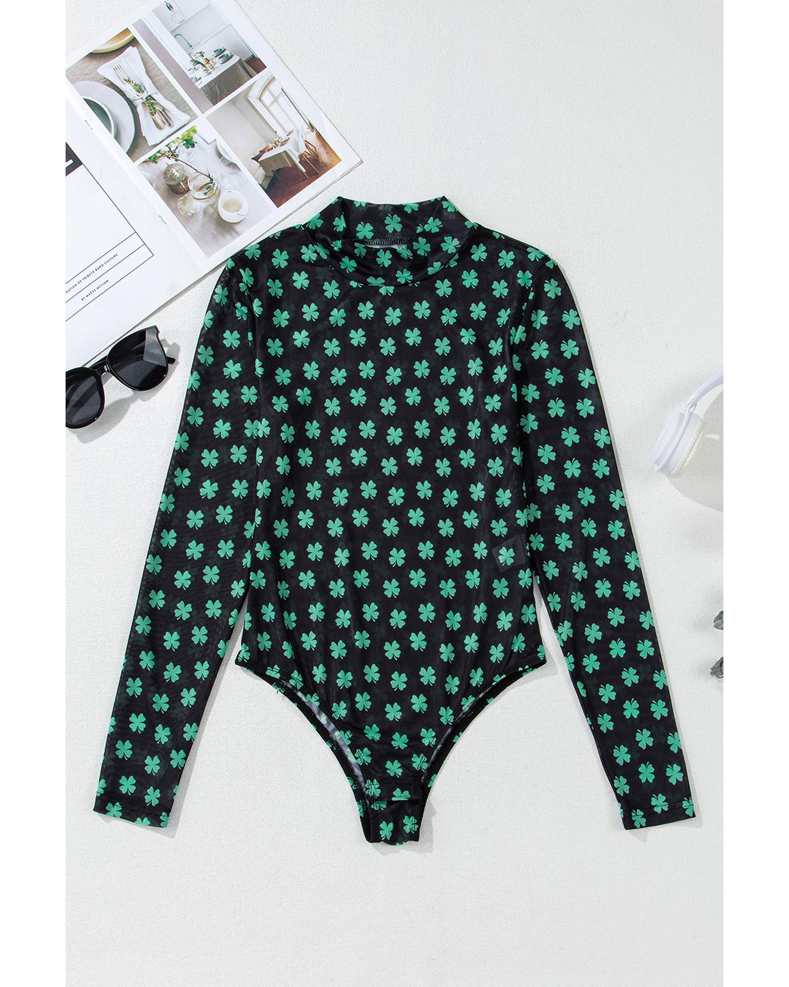 Green St Patrick Shamrock Printed Long Sleeve Mesh Bodysuit – S