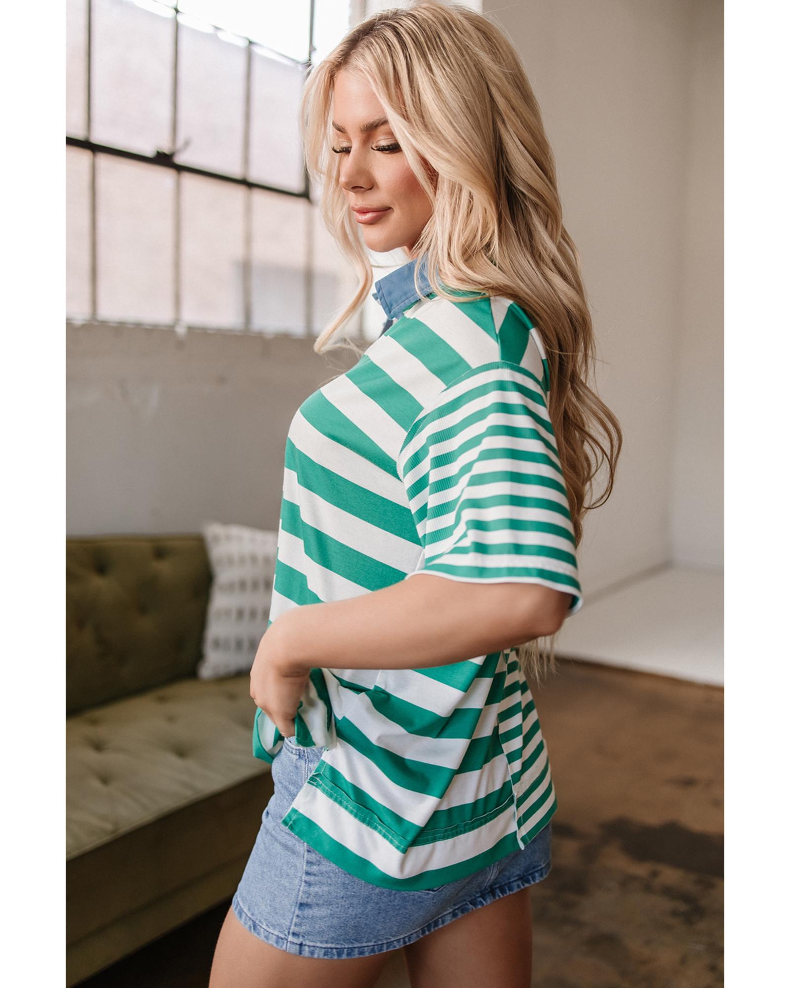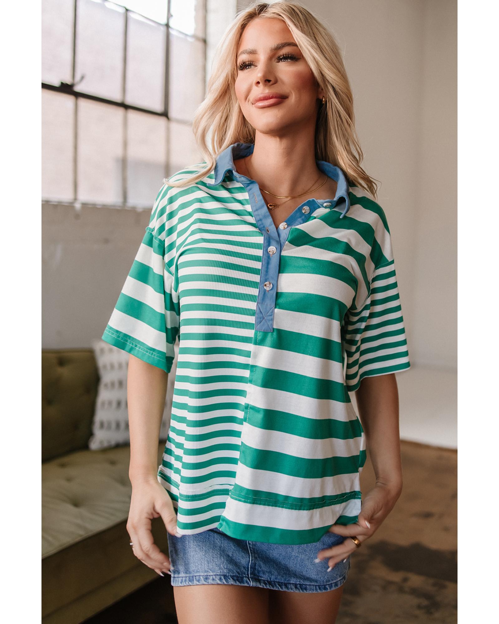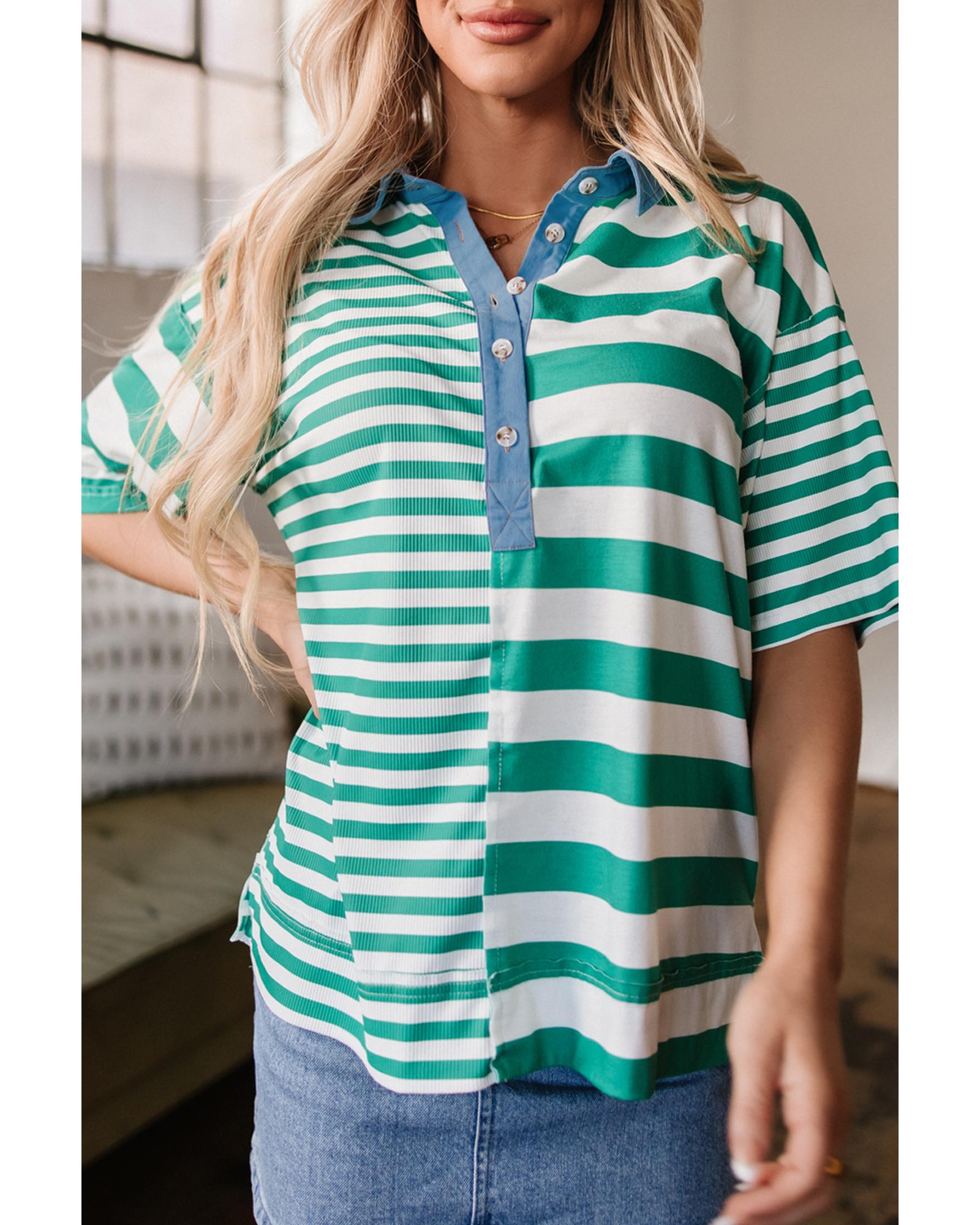 Green Stripe Colorblock Collar Half Buttons T Shirt – M