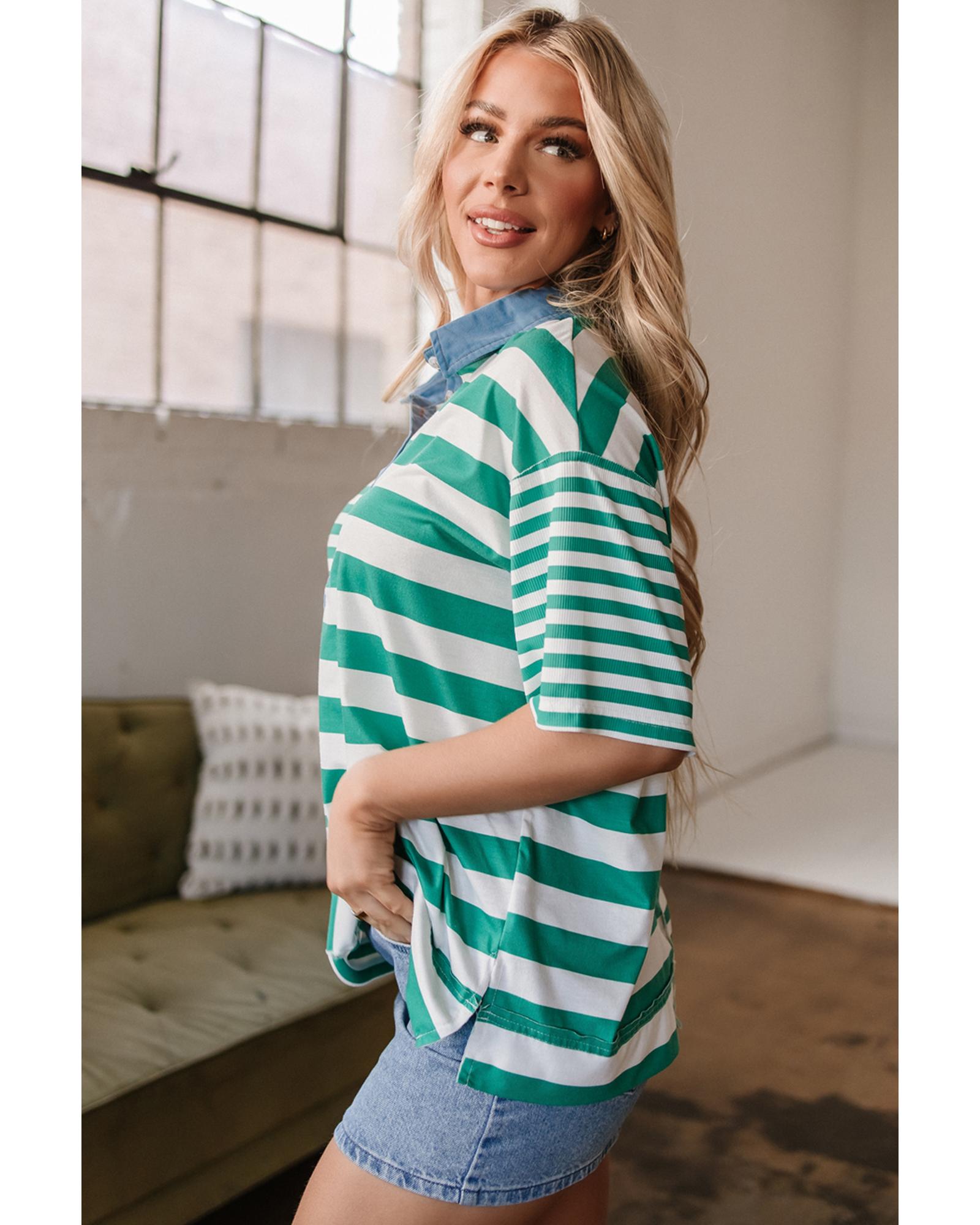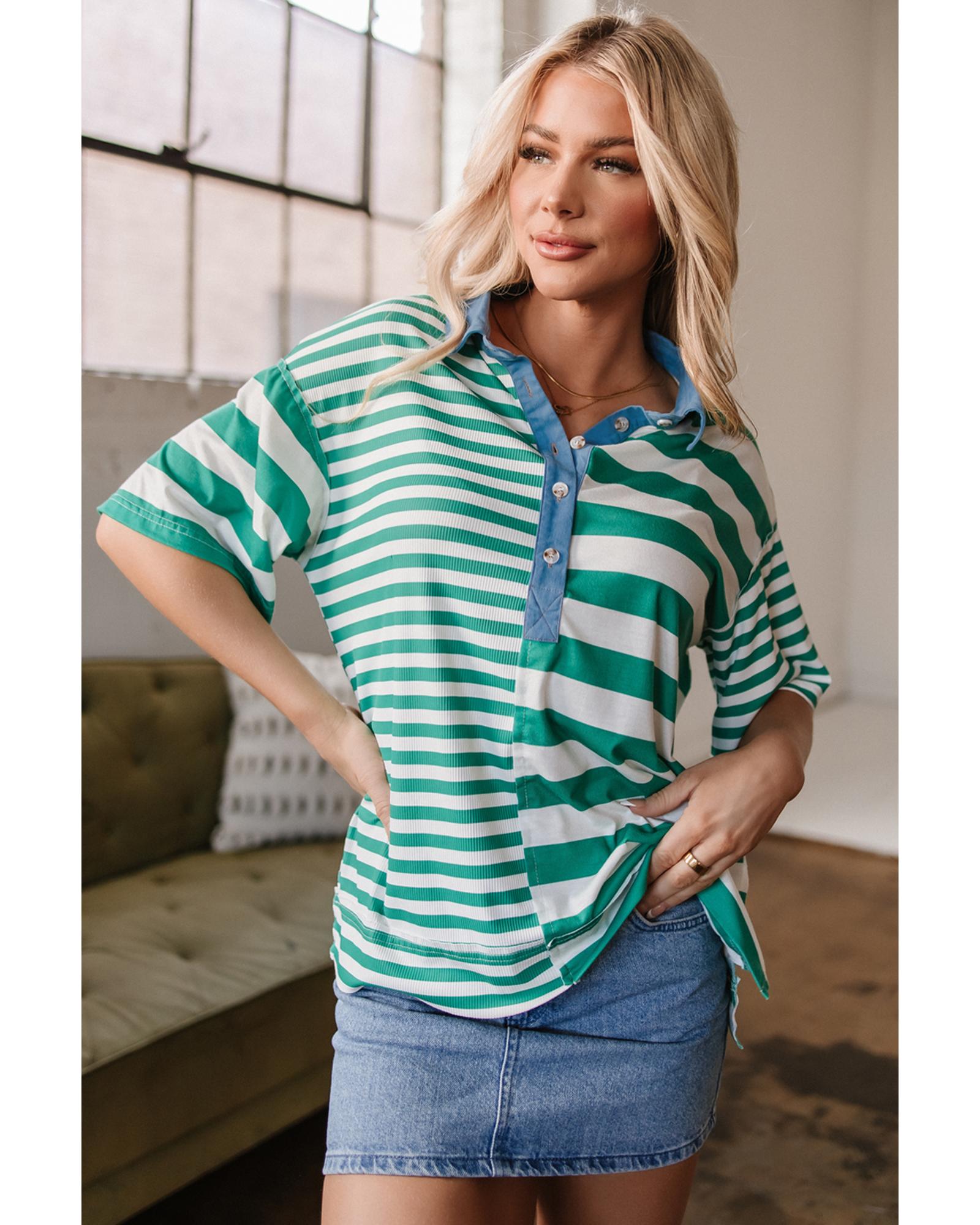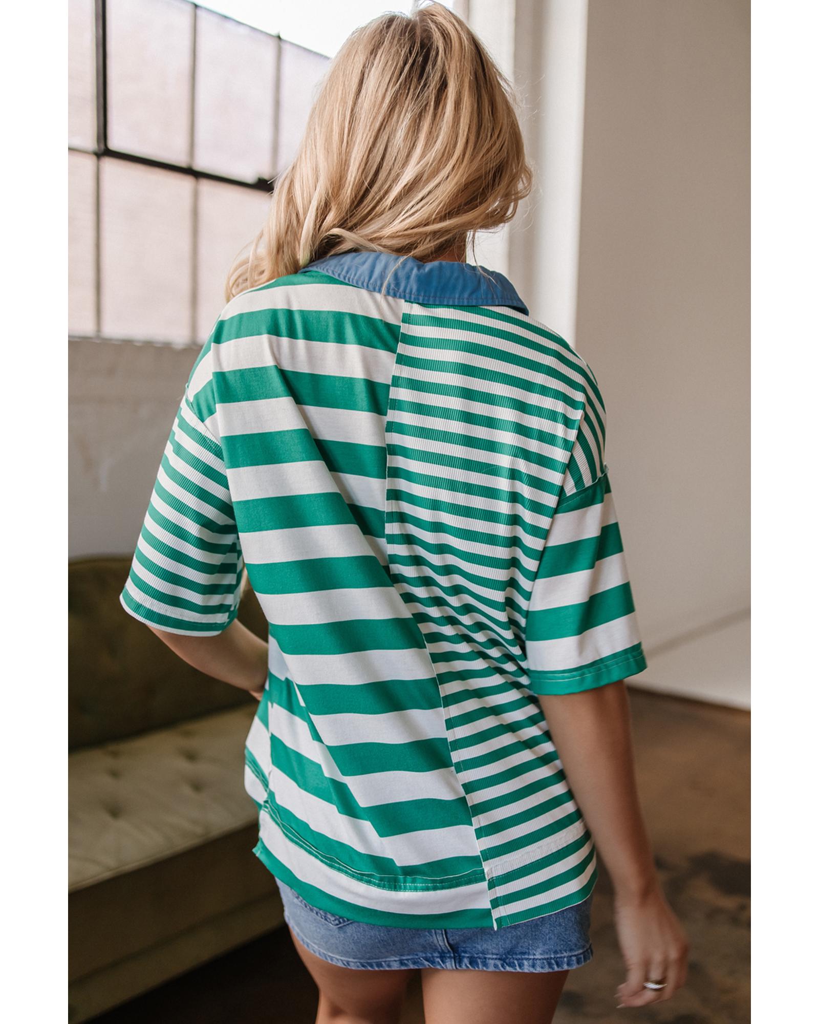 Green Stripe Colorblock Collar Half Buttons T Shirt – XL