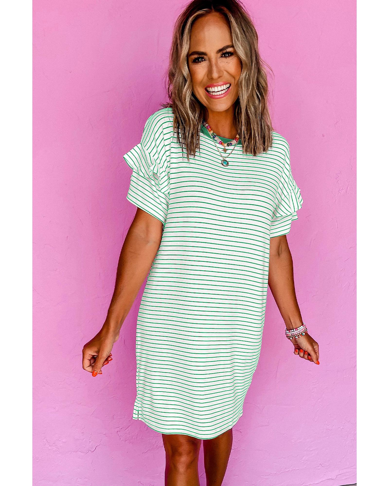 - Green stripe pattern with ruffled sleeve details