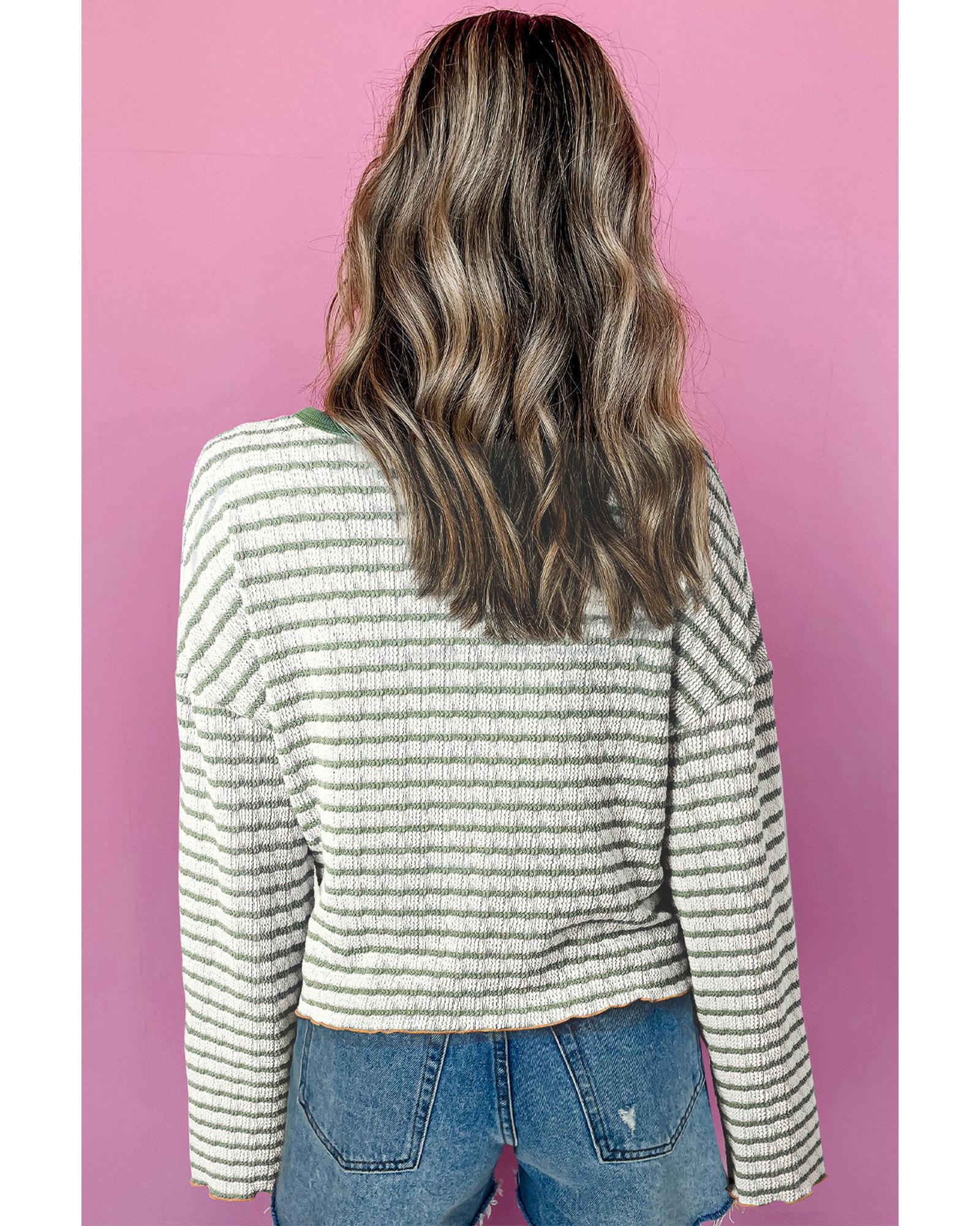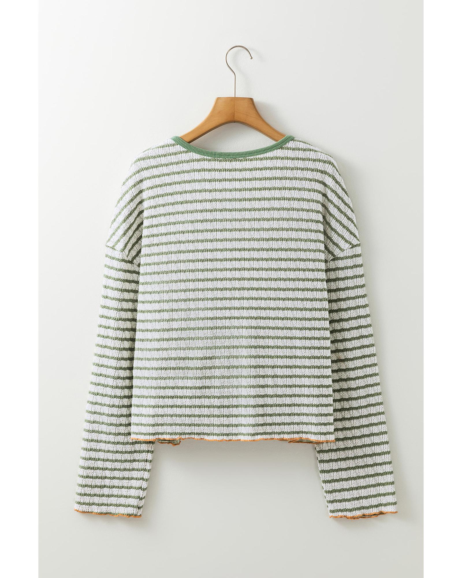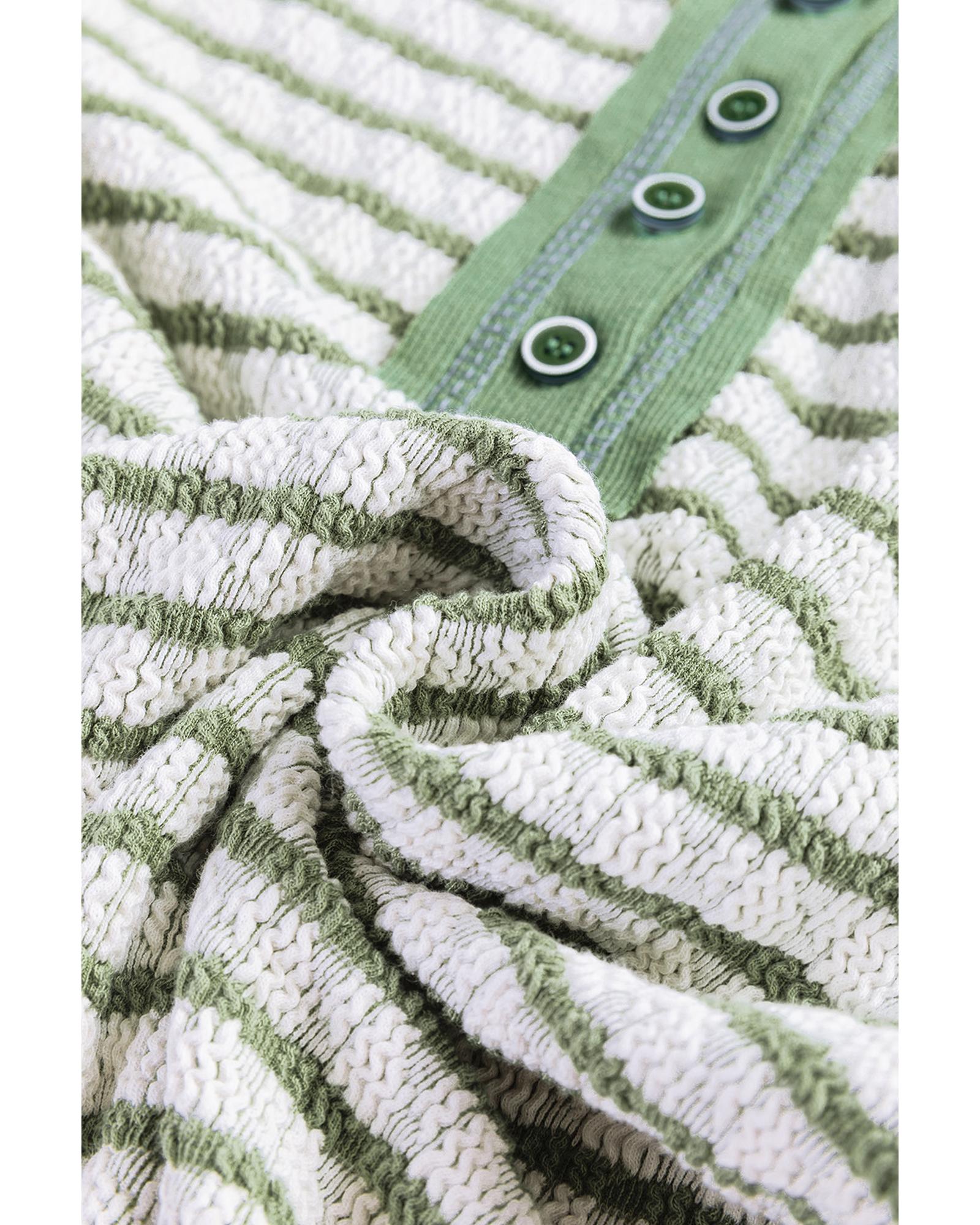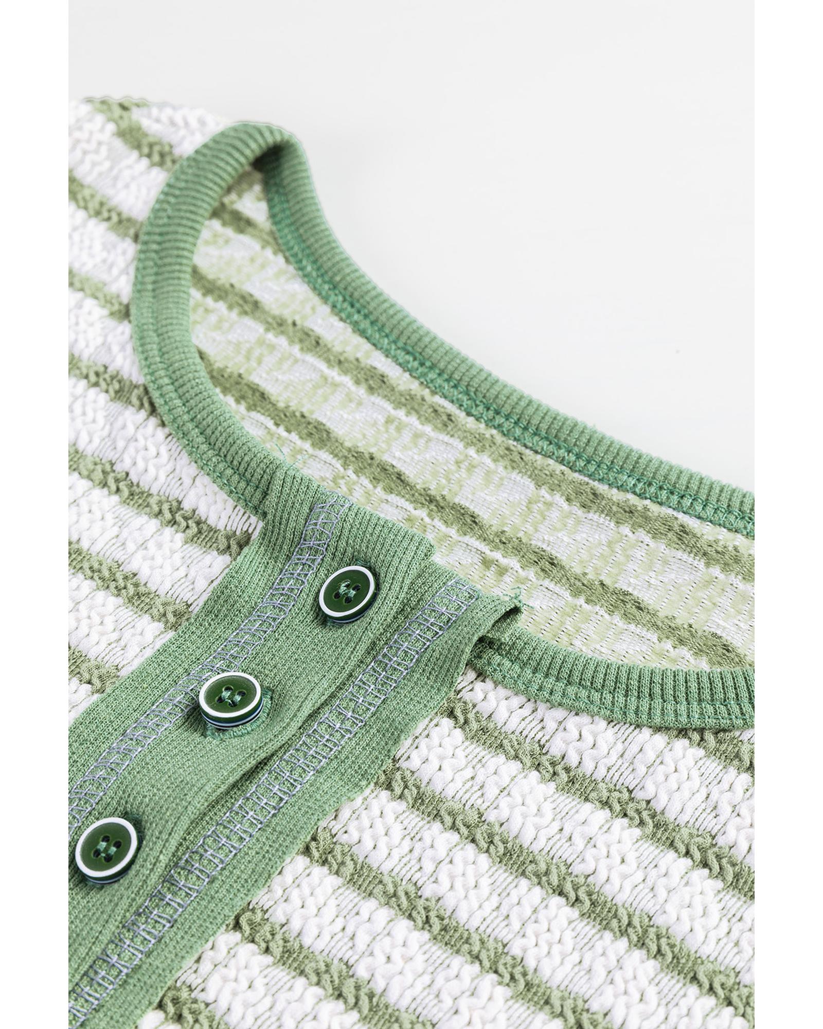 Green Stripe Textured Frilly Trim Buttons Henley Long Sleeve Top – XL