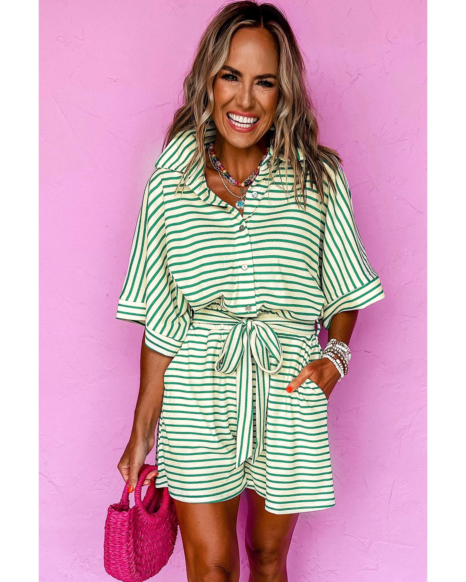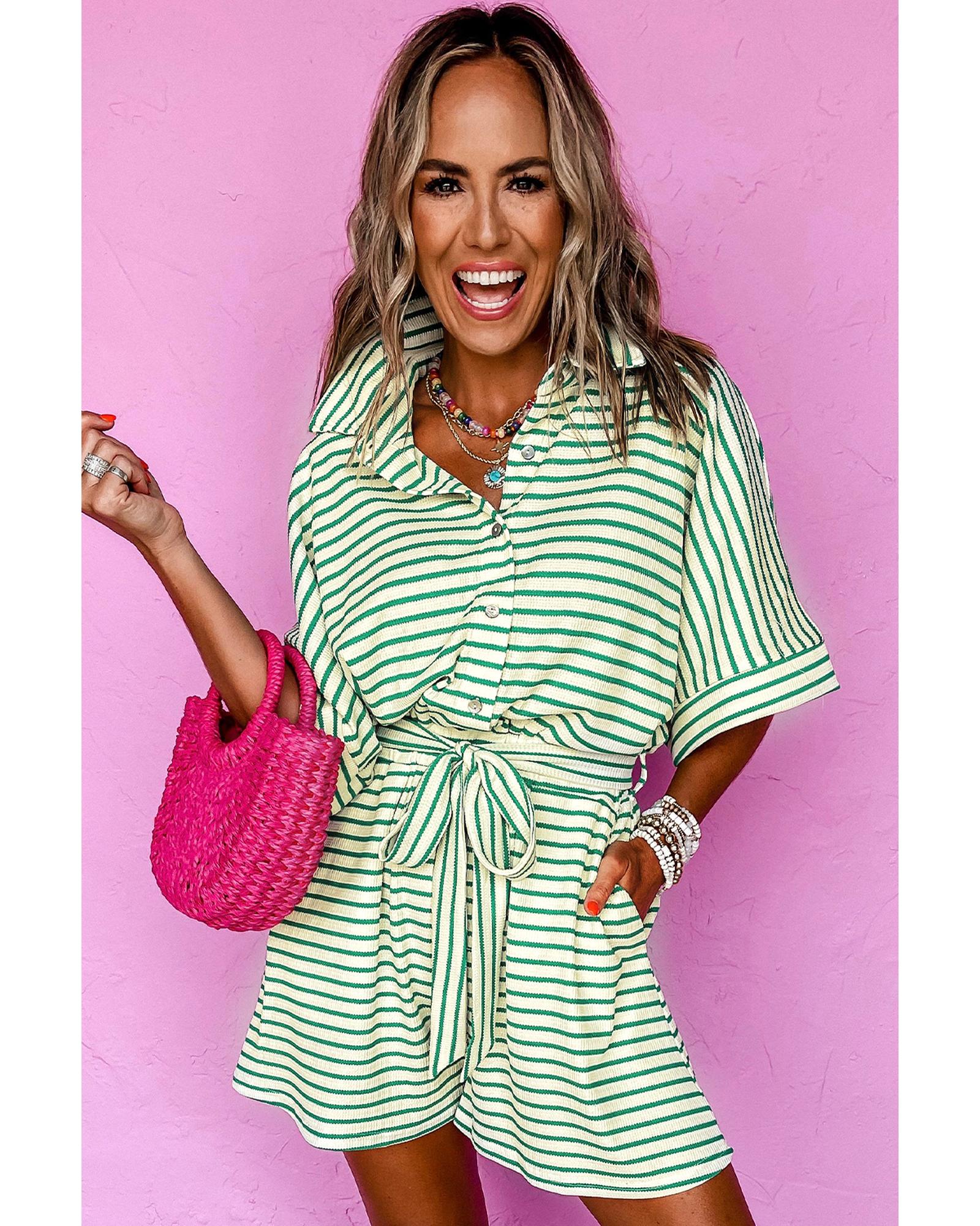 This Green Stripe Textured Short Sleeve Collared Buttoned Waist Tie Romper offers a stylish and versatile addition to any wardrobe. Designed with a trendy fitted silhouette, it combines luxurious craftsmanship with a timeless design, making it suitable for various occasions.
