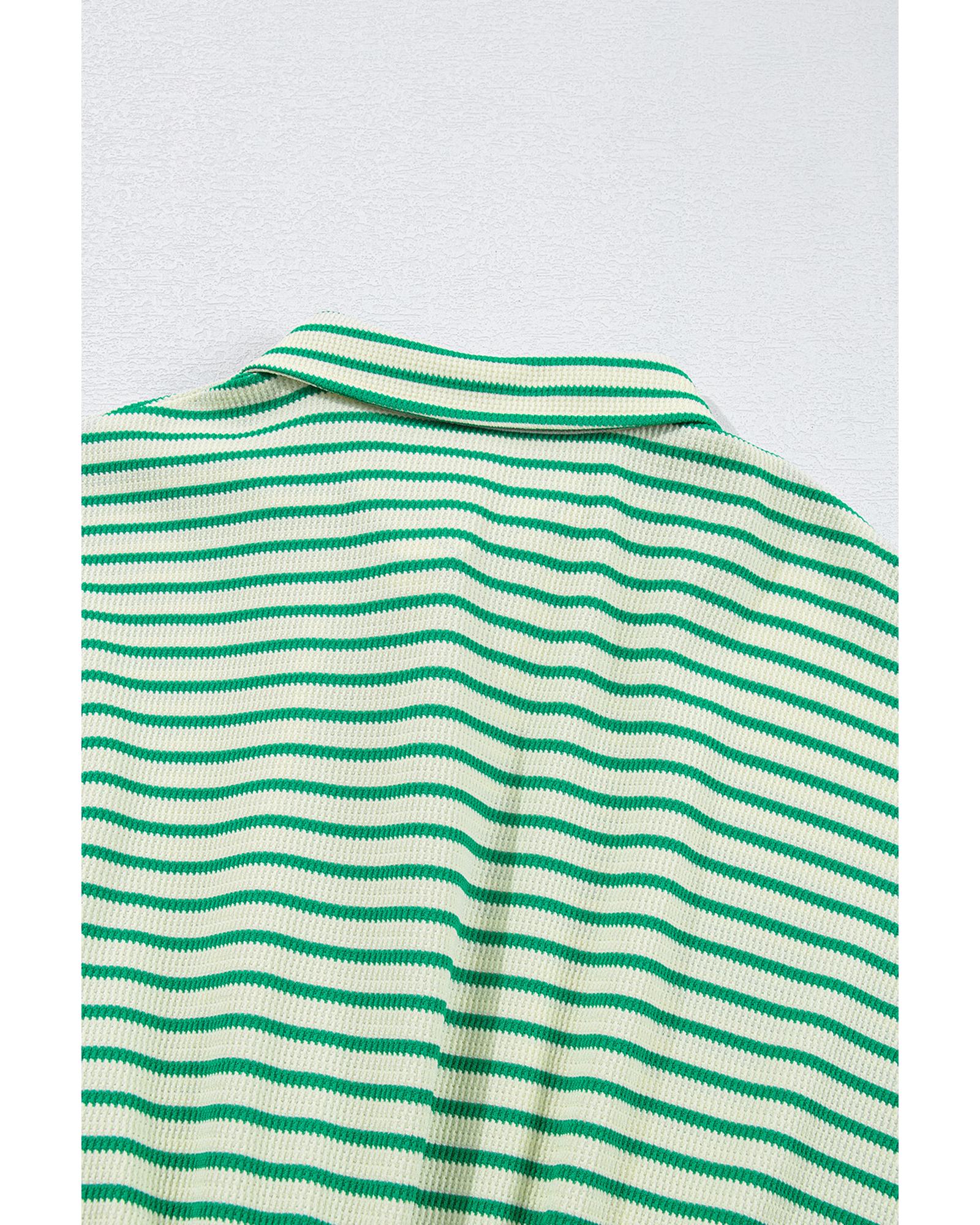 Green Stripe Textured Short Sleeve Collared Buttoned Waist Tie Romper – L