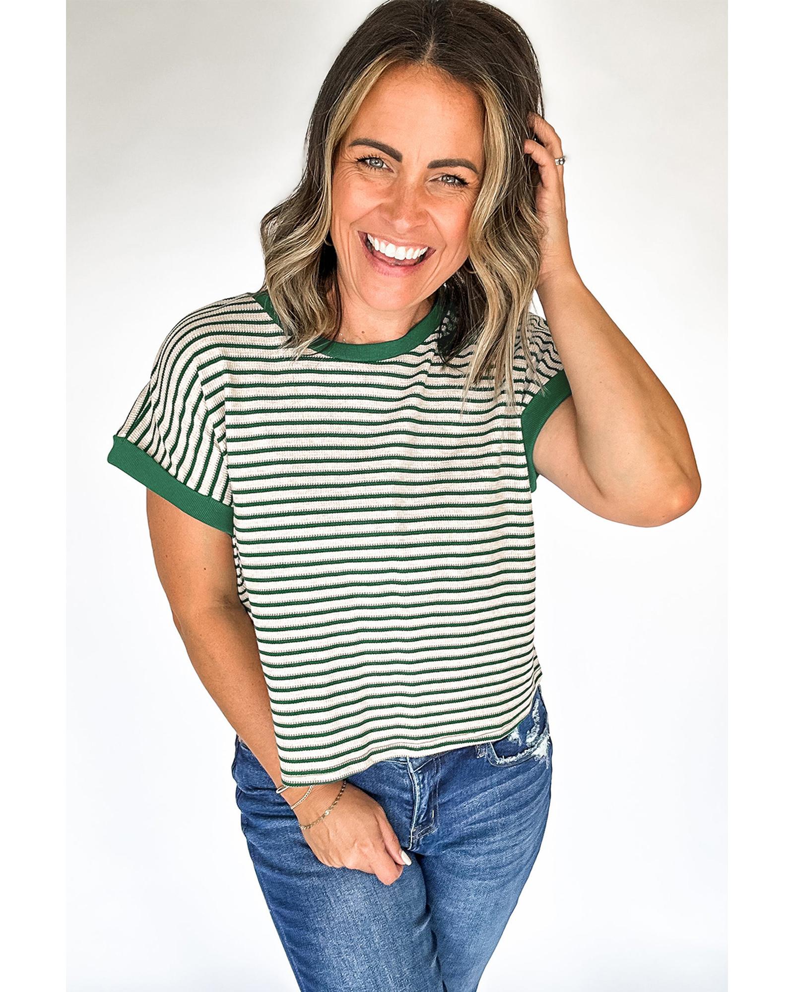 Green Stripe Trimmed Round Neck Plus Size Boxy Fit T-shirt – 2X