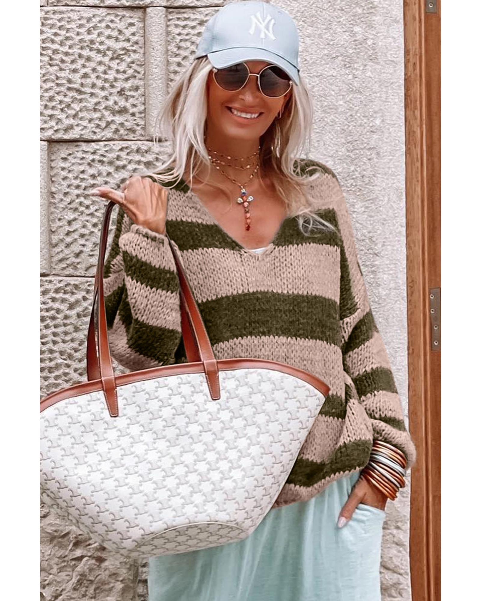 Green Striped Colorblock Knit V Neck Loose Fit Sweater – M