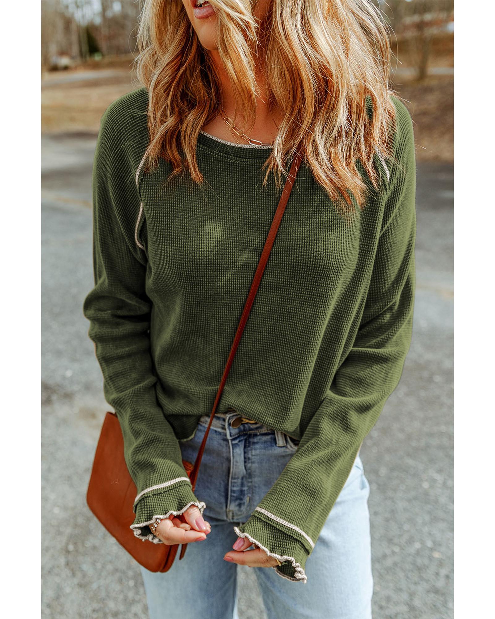 This green textured round neck long sleeve top offers a stylish and comfortable option suitable for various occasions. Designed with a trendy fitted silhouette, it combines unique knit texture with a flattering neckline, making it a versatile addition to any wardrobe. Crafted from soft and breathable materials, it ensures all-day comfort for both casual and dressier looks.