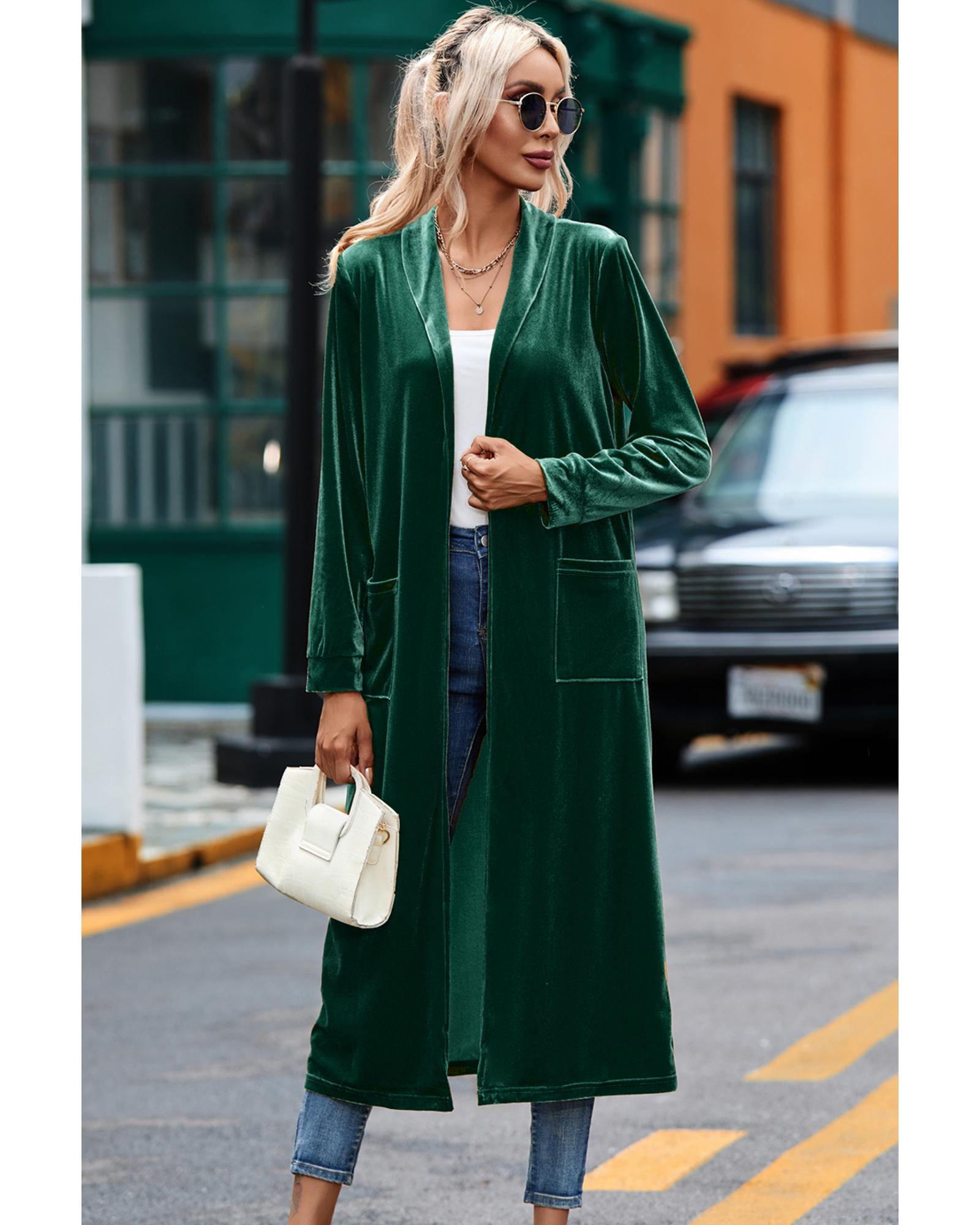 This long velvet duster features an open front design with convenient side pockets, offering a stylish and versatile addition to your wardrobe. Crafted from soft, lightweight velvet fabric, it provides comfort and a chic look suitable for various outfits. Ideal for cooler days in spring and autumn, this piece combines fashion and functionality effortlessly.
