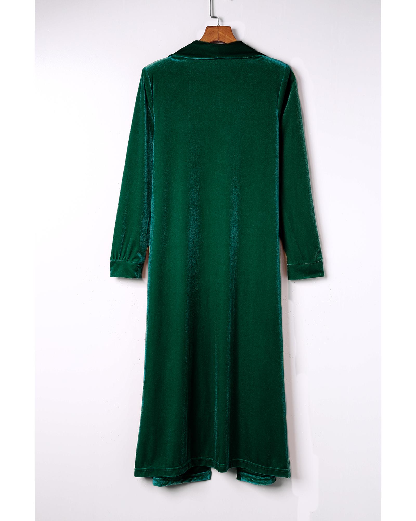 This long velvet duster features an open front design with convenient side pockets, offering a versatile and stylish addition to your wardrobe. Crafted from soft, lightweight velvet fabric, it provides comfort and a chic look suitable for various outfits. Ideal for cooler days in spring and autumn, this piece combines fashion and functionality.