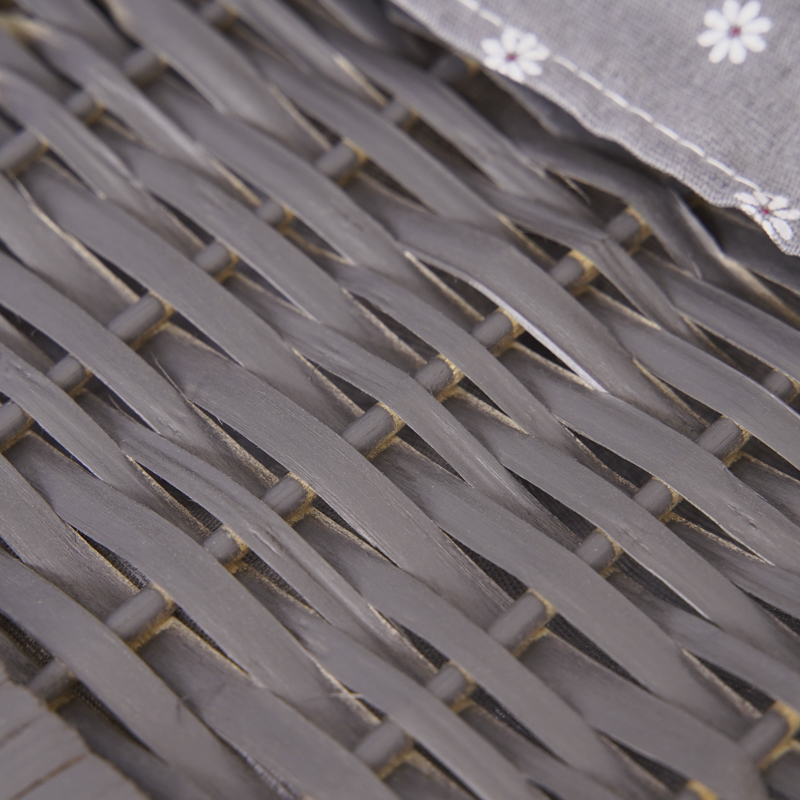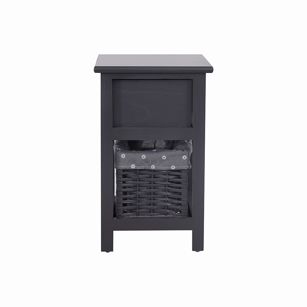 This bedside table features a combination of solid wood and artificial wood with a neutral gray finish, offering an elegant and classic appearance. Its delicate curved structure and sturdy top line enhance its aesthetic appeal. The open drawer provides versatile storage options, while the spacious top surface is suitable for placing a lamp, alarm clock, or other bedside essentials. Additionally, a wicker basket at the bottom of the drawer offers extra space for small, infrequently used items. All surfaces are waterproof and easy to clean.