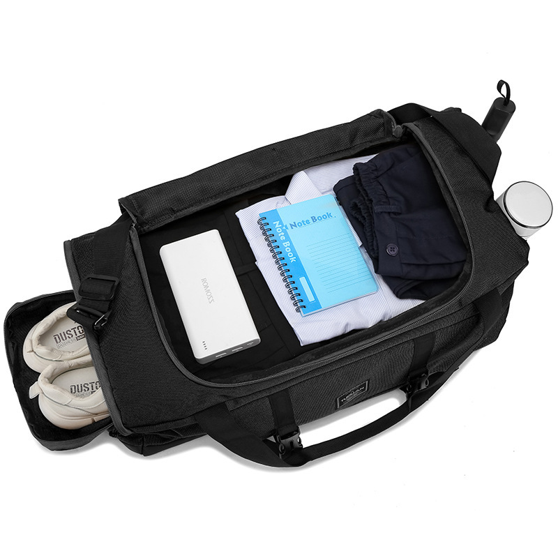 This versatile gym bag is designed to keep your essentials organized and easily accessible. It features multiple compartments including a wet/dry separation section, a dedicated shoe compartment, and a spacious main area. The bag also includes straps for securing a yoga mat and side pockets for water bottles or umbrellas, making it suitable for various activities such as fitness, travel, or daily use.