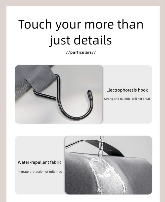 • Features: Hanging hook, multiple compartments, top handle, water-resistant