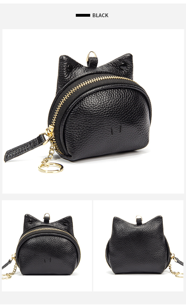 This adorable coin purse combines playful design with practical functionality. Made from high-quality genuine leather, it offers durability and a soft, luxurious feel. Its compact size makes it easy to carry, while the secure zipper closure keeps your small valuables safe. The interior features multiple compartments and a keyring chain for organization, making it suitable for coins, keys, and small essentials.