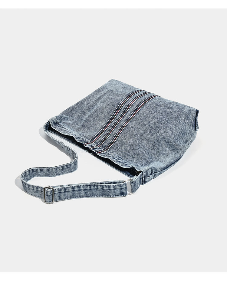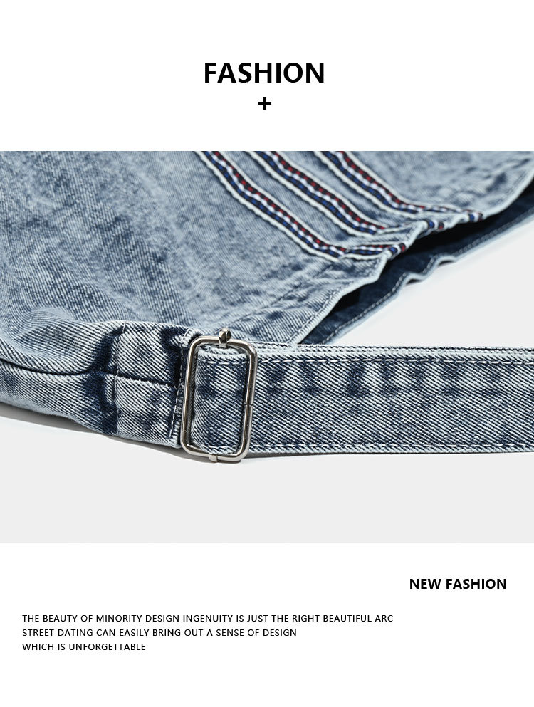 - Includes subtle striped accents on the front, adding a stylish detail to its classic denim appearance.