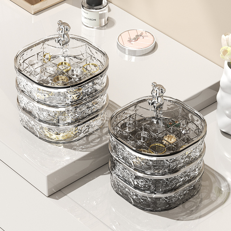 This grey three-layer jewelry organizer box features a rotatable design, allowing 360-degree access to all compartments. Made from durable PET and ABS materials, it offers a sleek, transparent appearance with a modern silver finish. The organizer includes anti-oxidation compartments that help protect jewelry from tarnishing, ensuring long-lasting brilliance. Its compact size makes it suitable for dressing tables and countertops, providing versatile storage for earrings, necklaces, rings, and small accessories.