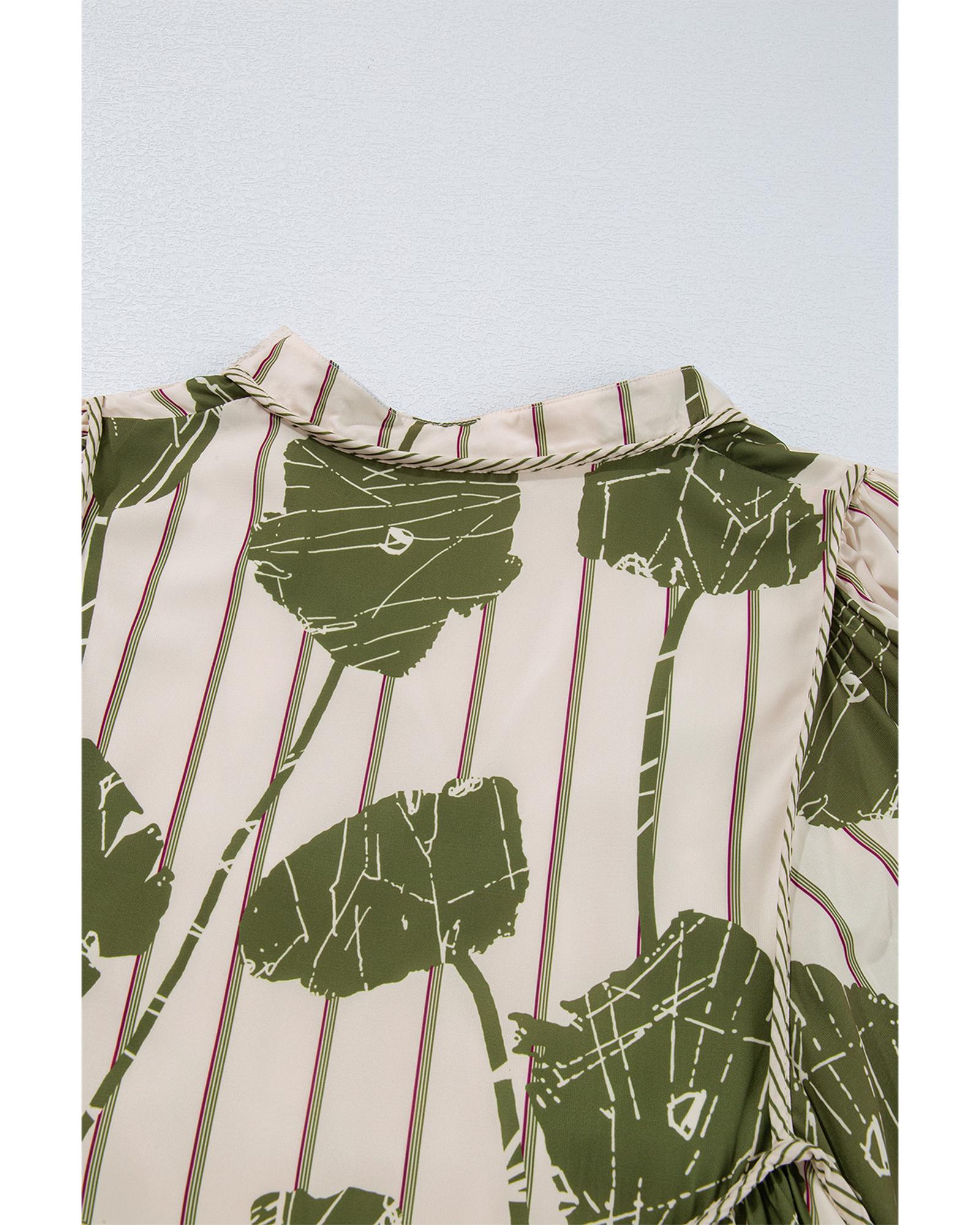 Guacamole Green Floral Striped Print Contrast Piping Puff Sleeve Dress – L