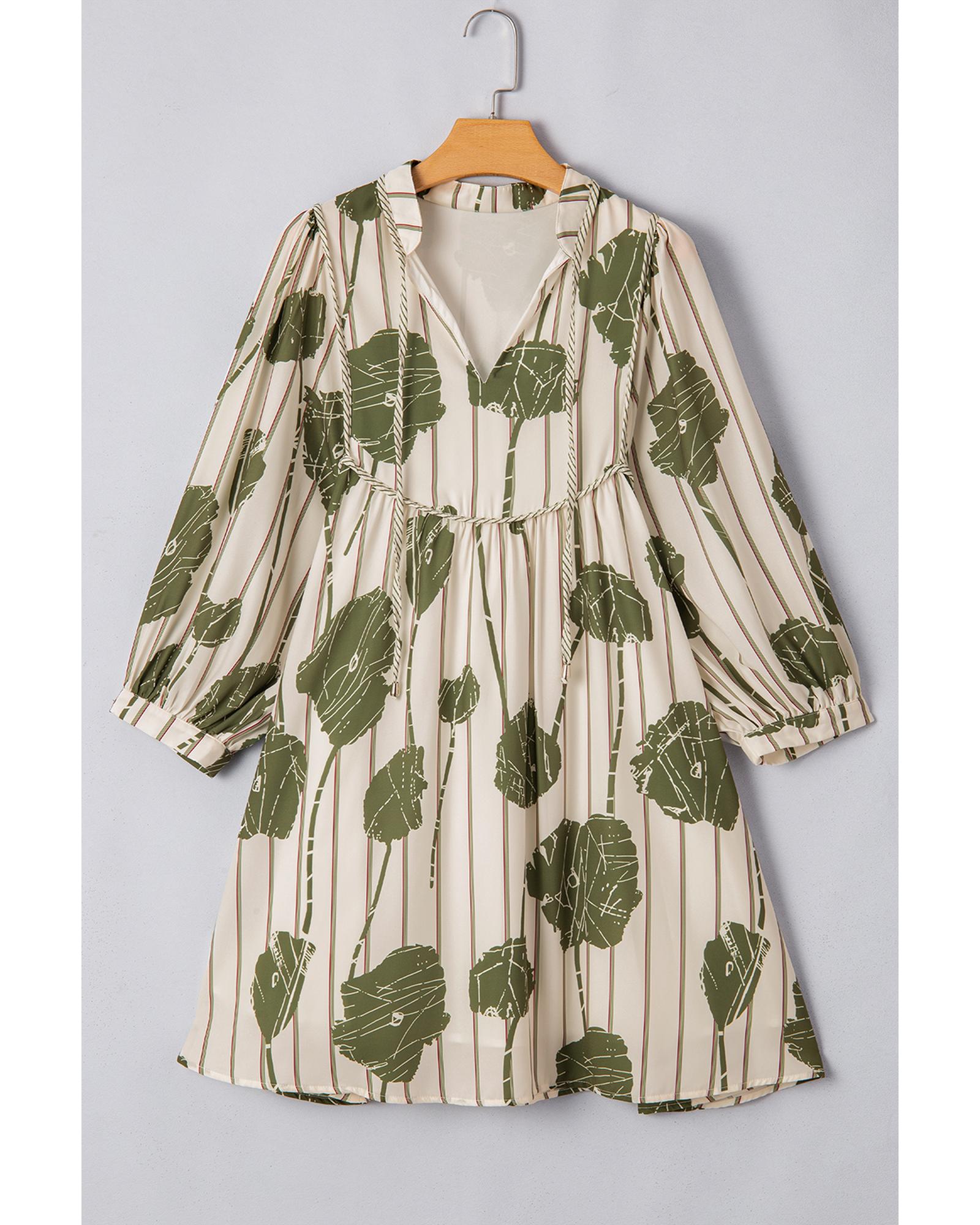 This dress features a vibrant green floral print with a striped background, designed with a trendy fitted silhouette. It offers a stylish and playful look suitable for various occasions, from casual outings to special events.