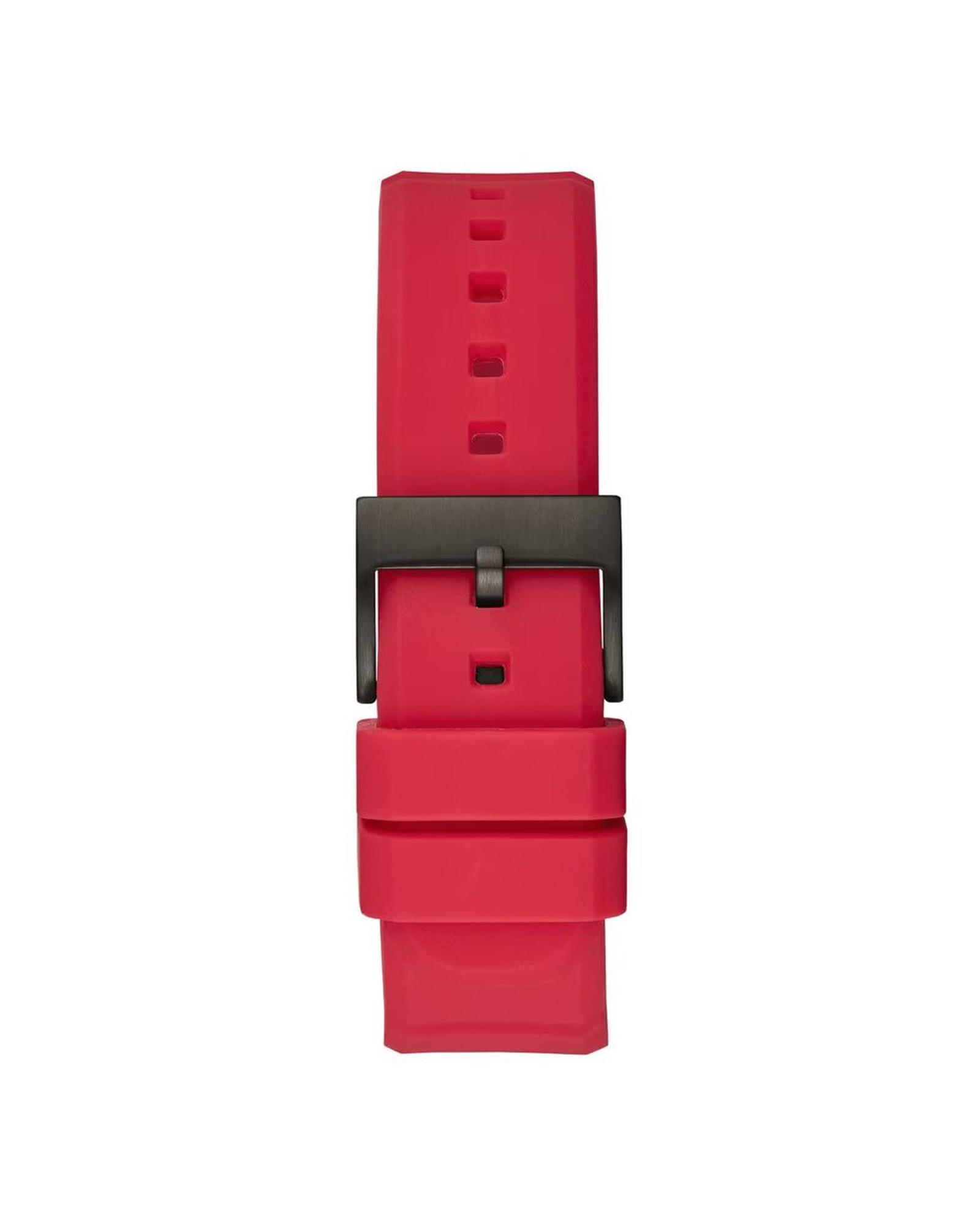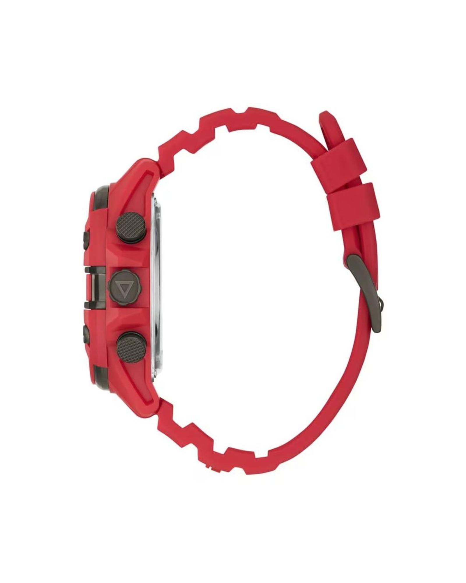 This men’s watch features a bold red silicone strap and a matching red resin case, combining durability with a striking appearance. It offers both analog and digital displays, making it versatile for various preferences. The watch is designed to be water-resistant and suitable for everyday wear, with additional functionalities such as date display and G-force measurement.