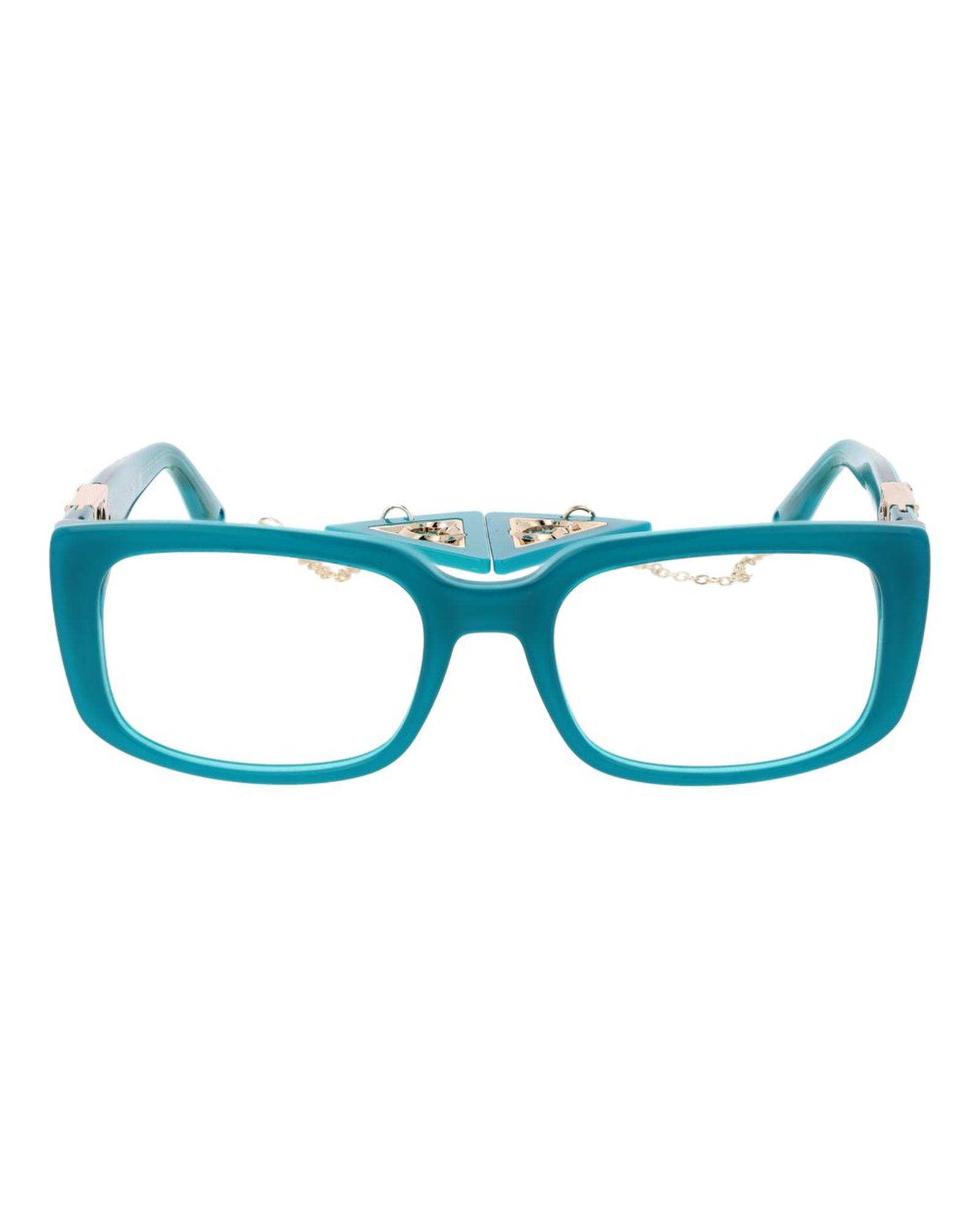 This pair of women’s optical frames features a stylish cat eye design with a vibrant turquoise color. Crafted from durable acetate, these frames are lightweight and comfortable for everyday wear. The included demo lenses are made of plastic, providing a clear view while maintaining a fashionable appearance. Designed with a full rim style, these frames combine elegance and practicality for a versatile accessory.