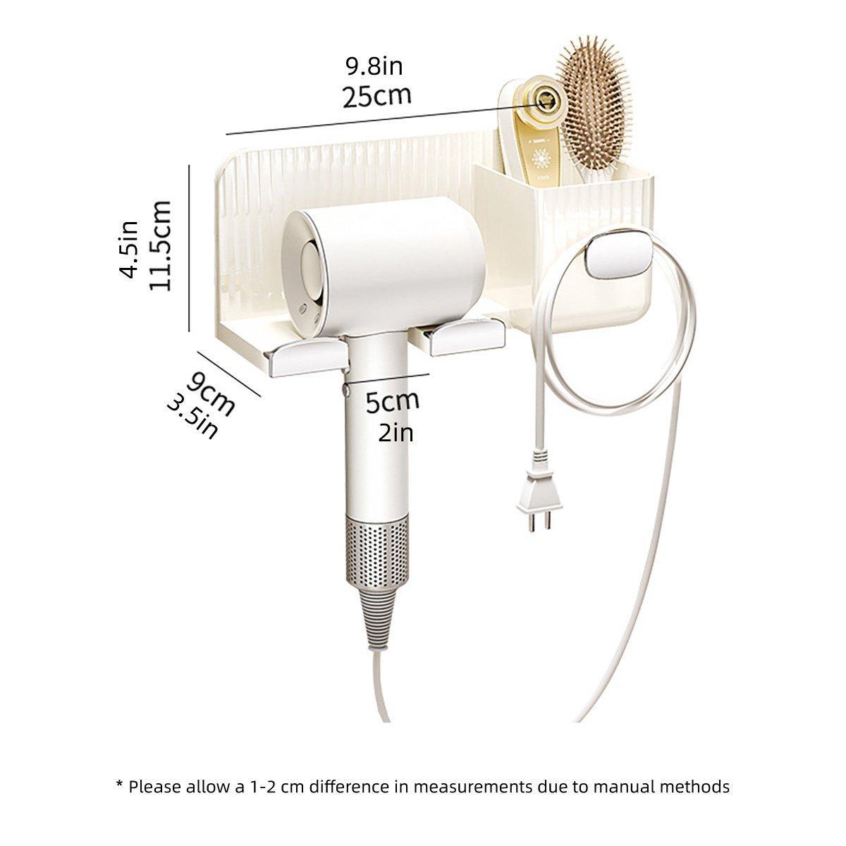 This wall-mounted hair dryer holder provides a practical and stylish solution for organizing bathroom essentials. Made from durable plastic with a smooth finish, it securely holds a hair dryer, accessories, and features additional compartments and hooks for cables, helping to keep your space tidy and organized.