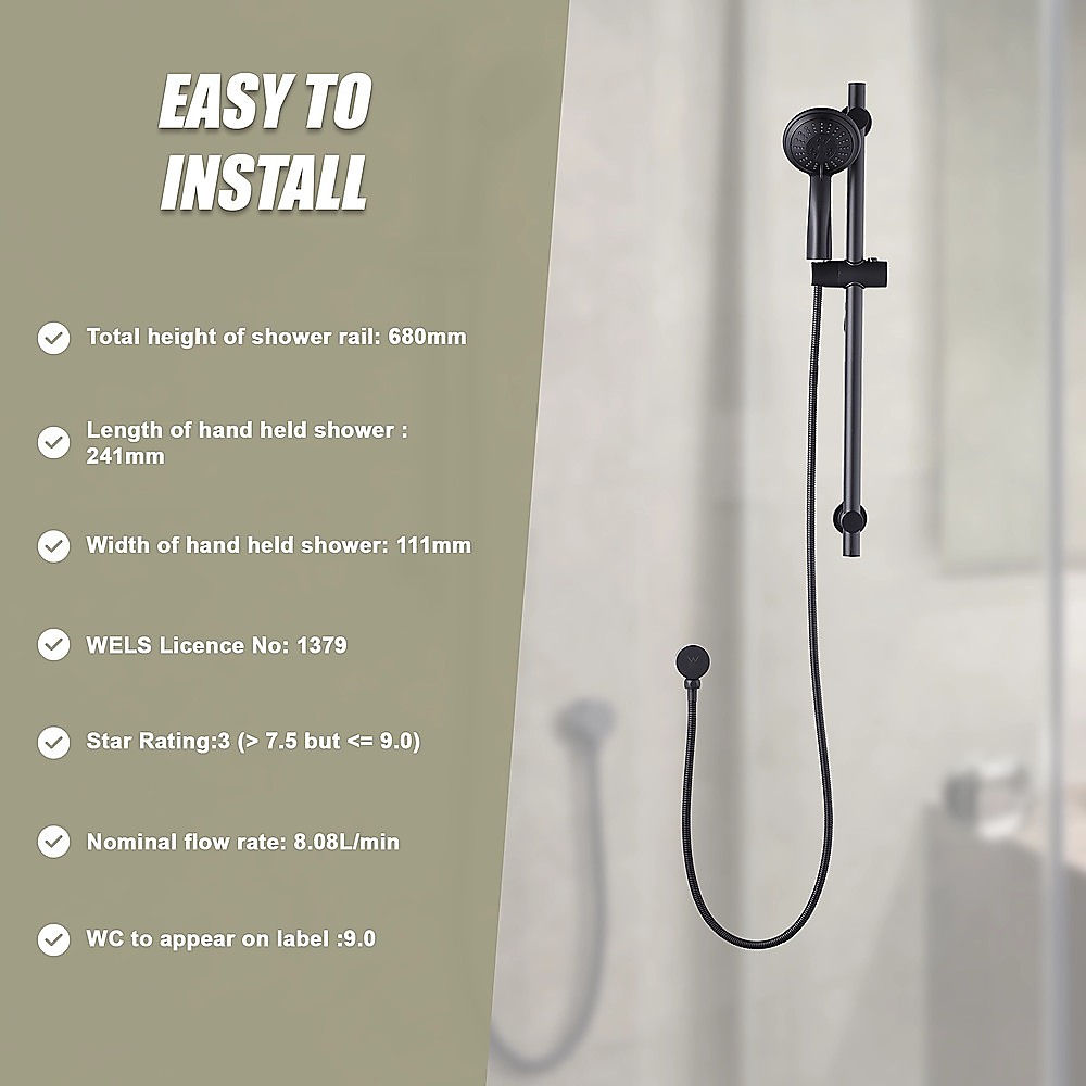 - Includes shower rail, round hand held shower, flexible cord, and hardware