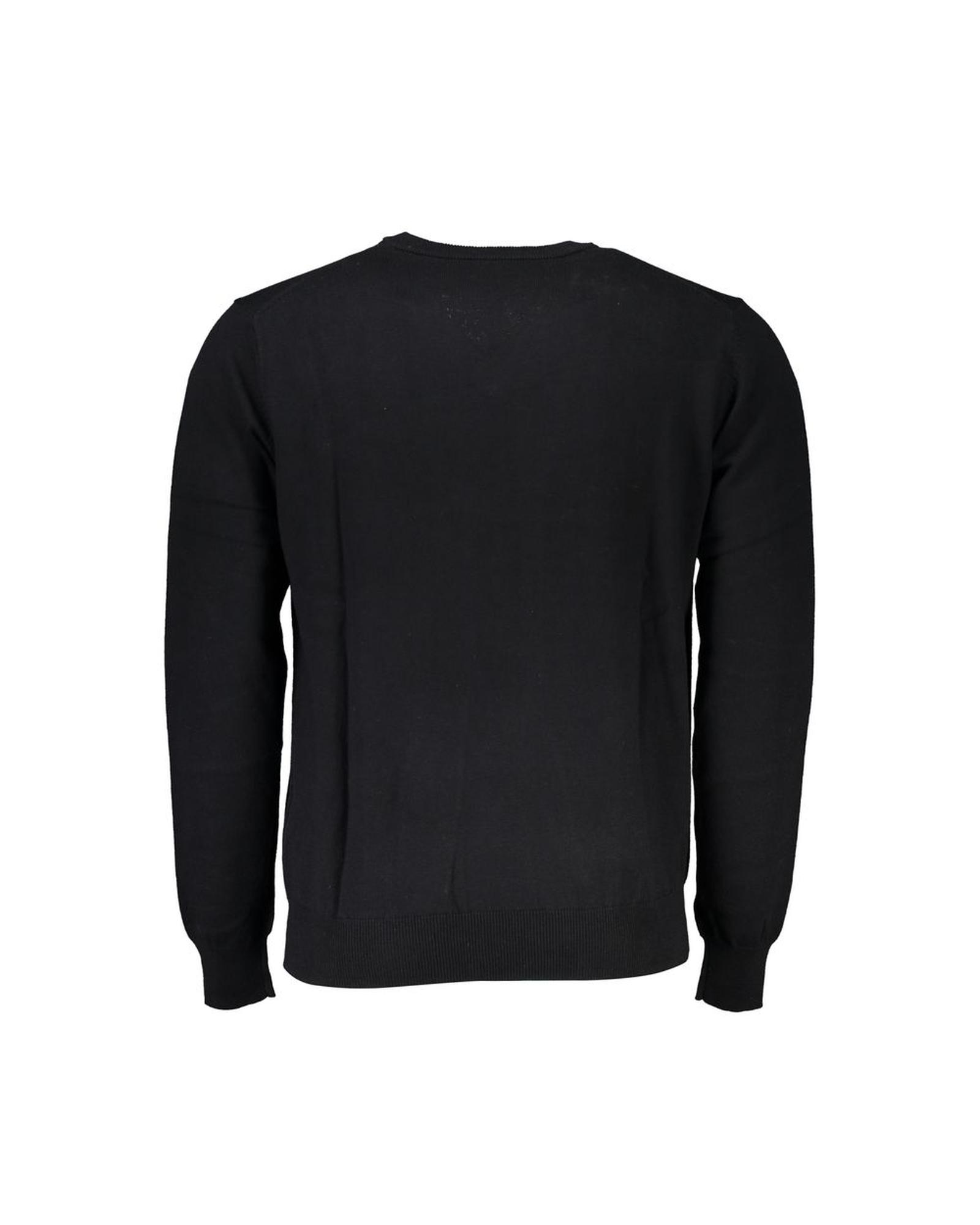 This men’s black cotton sweater features a classic design with detailed embroidery work and a brand logo. It offers a comfortable fit with long sleeves and a V-neck style, making it suitable for various casual occasions.