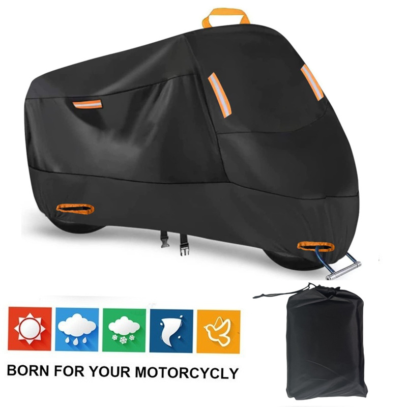 This heavy-duty motorcycle cover provides all-season outdoor protection with features designed to withstand harsh weather conditions. It is equipped with lock holes and windproof buckles to ensure a secure fit and reliable coverage for your motorcycle.