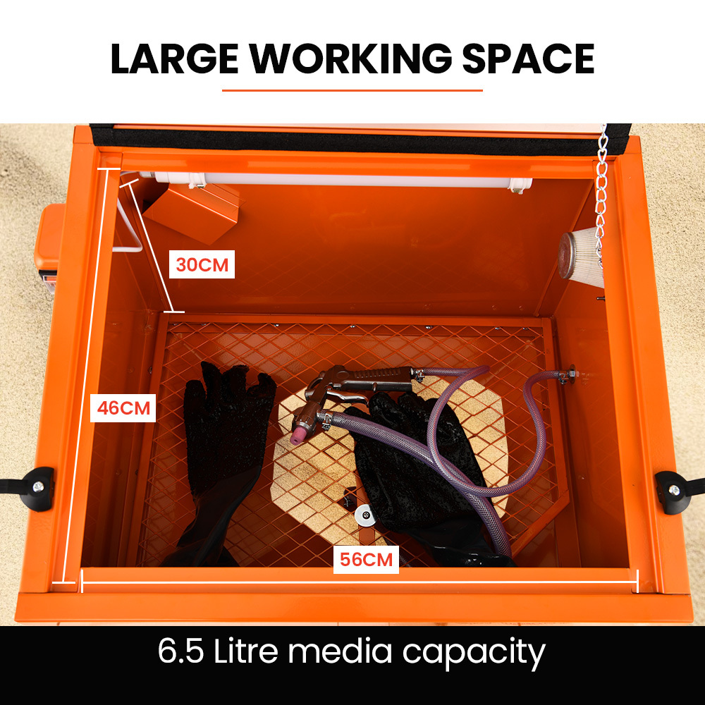 This heavy-duty steel sandblasting cabinet is designed for efficient and professional-grade surface cleaning. It features a fully enclosed design that recycles and collects blasting media, making it suitable for various applications including rust removal, engine part cleaning, and antique restoration. The cabinet is equipped with safety and convenience features such as internal LED lighting, protective gloves, and versatile nozzles for different blasting needs.