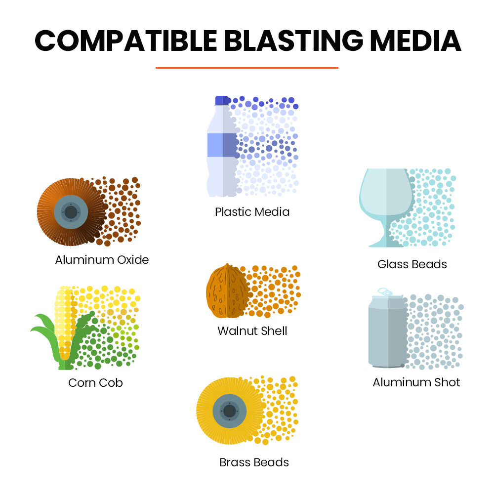 - Suitable sand types: Glass bead, silicon carbide, alumina, walnut shell, brass bead