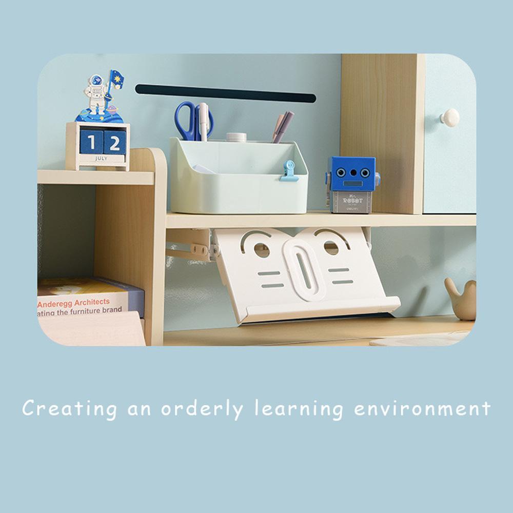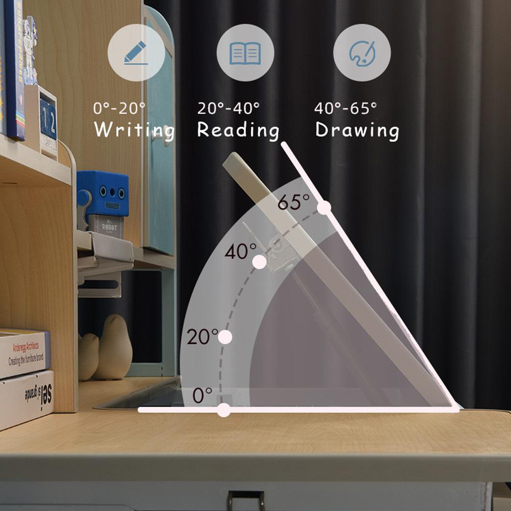 This ergonomic study desk set is designed for children and teenagers, providing a versatile and adjustable workspace that supports learning, drawing, and reading activities. Made from solid rubber wood with a wood grain surface, the desk features adjustable height and tilt angles to accommodate growth and different tasks. It includes multiple storage options such as a bookshelf, drawer, and book holder, creating an organized and comfortable environment for young users.