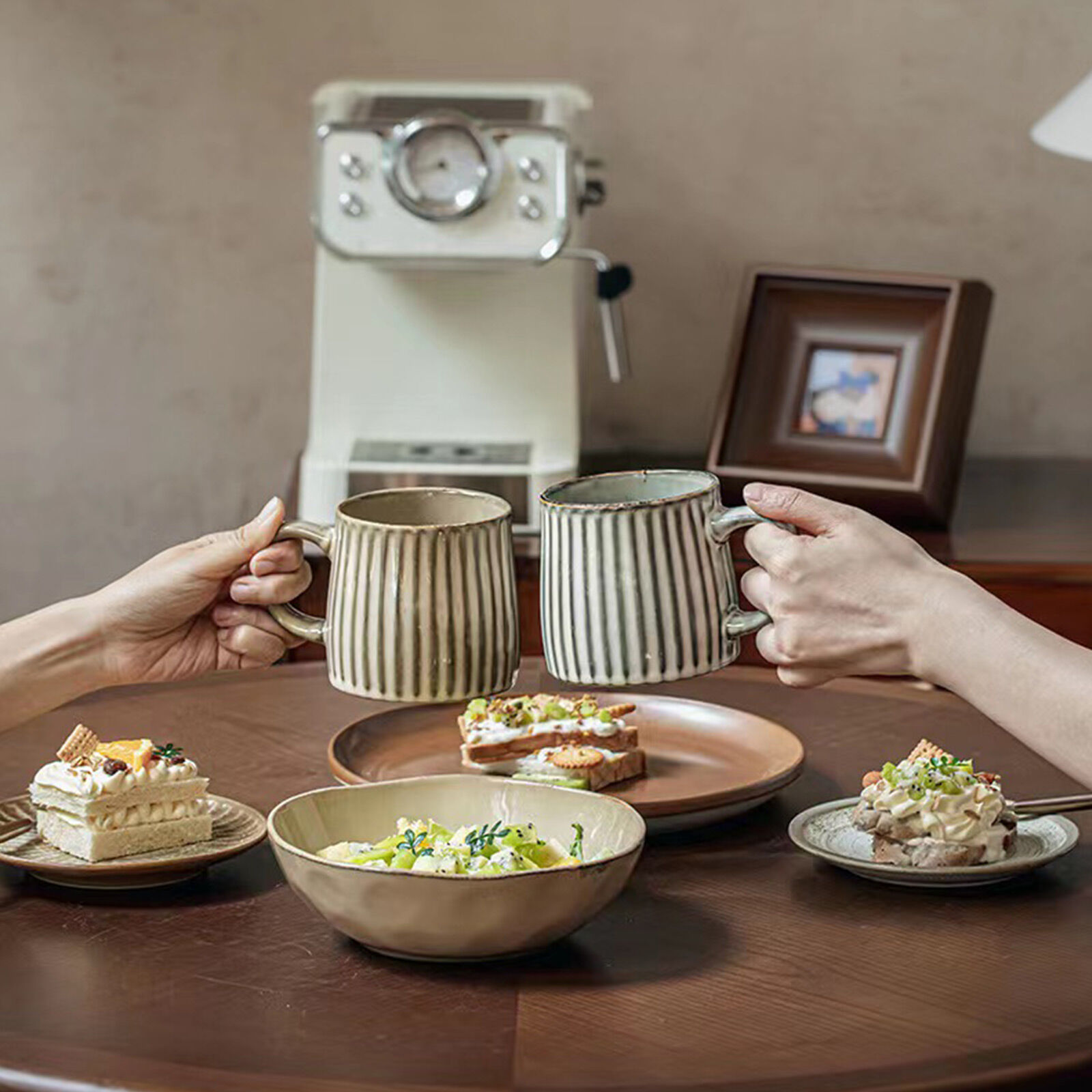This high-fired ceramic stoneware mug combines practicality with understated elegance, making it suitable for everyday tea or coffee moments. Crafted from durable porcelain with a matte, speckled finish, it features a ribbed striped pattern in earthy tones, creating a natural and calming aesthetic.