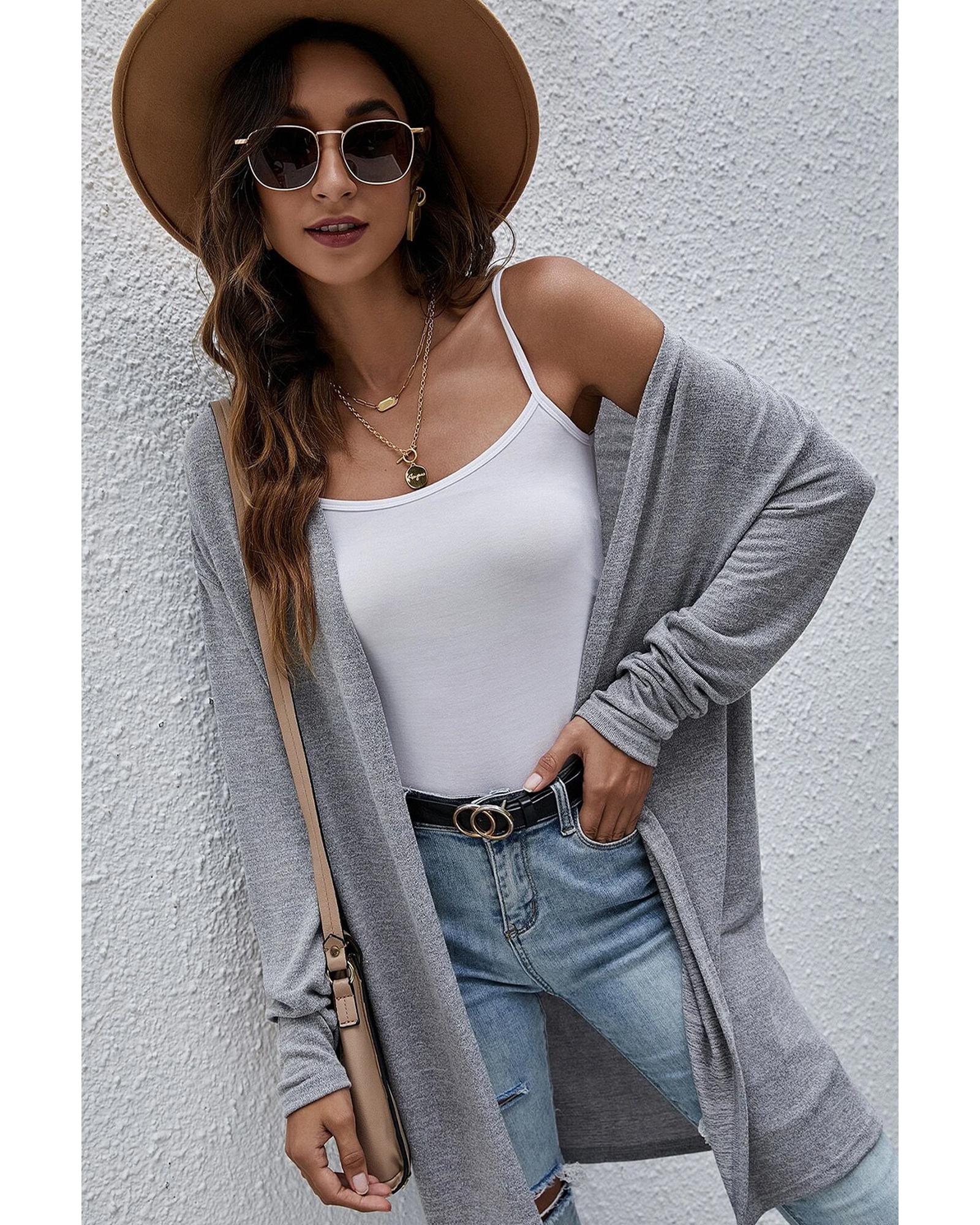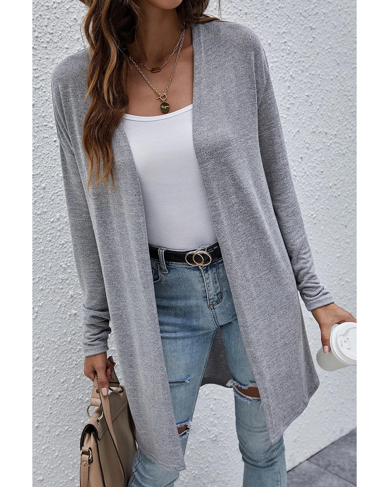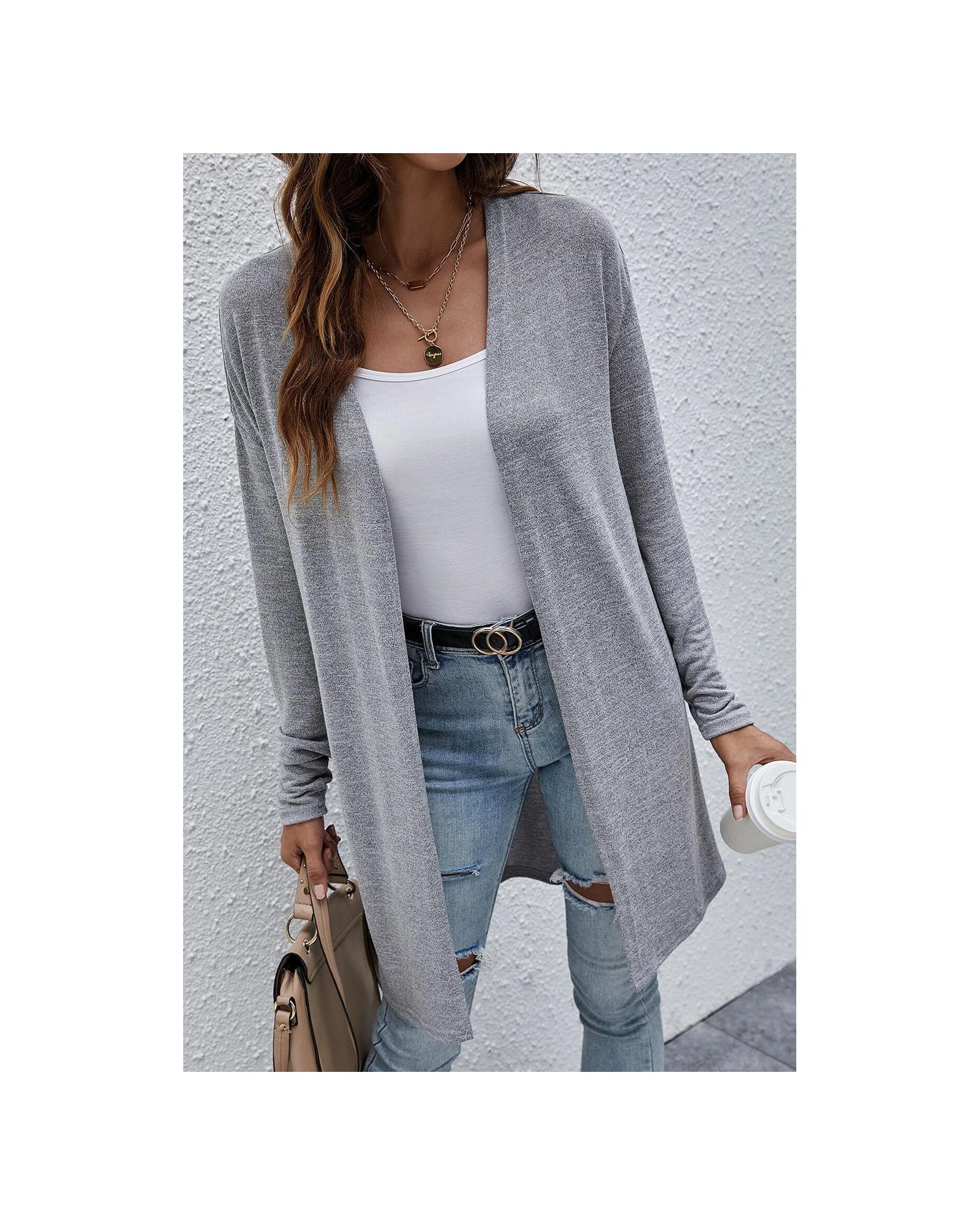 This high-rise solid color open front lightweight cardigan offers a versatile and stylish layering option. Designed with a trendy fitted look, it is suitable for various outfits and seasons, providing comfort and ease of wear.