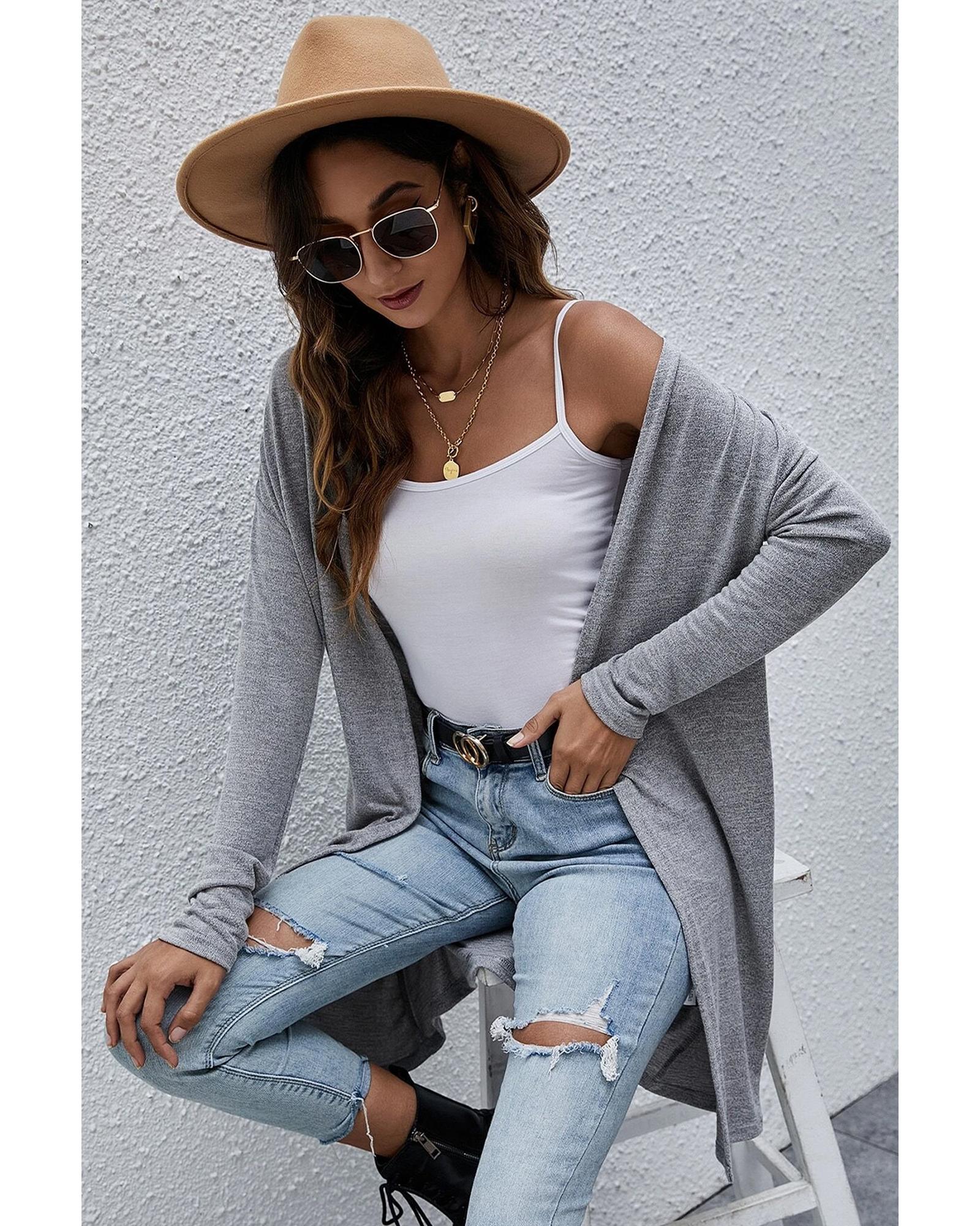 This high-rise solid color open front lightweight cardigan offers a versatile and stylish layering option suitable for various seasons. Designed with a trendy fitted look, it combines comfort and ease of wear, making it a great addition to any wardrobe.