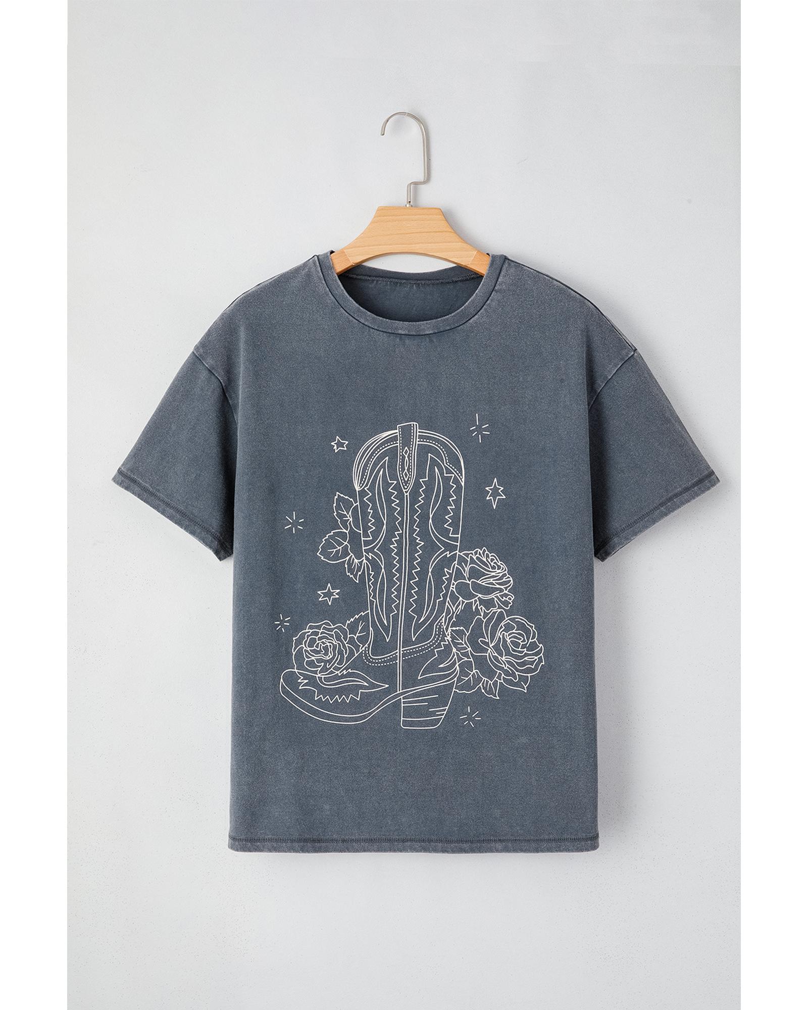 This graphic tee features a distinctive western cowboy boots design, adding a touch of cowboy flair to any outfit. It is suitable for daily wear and offers a comfortable fit for all users.