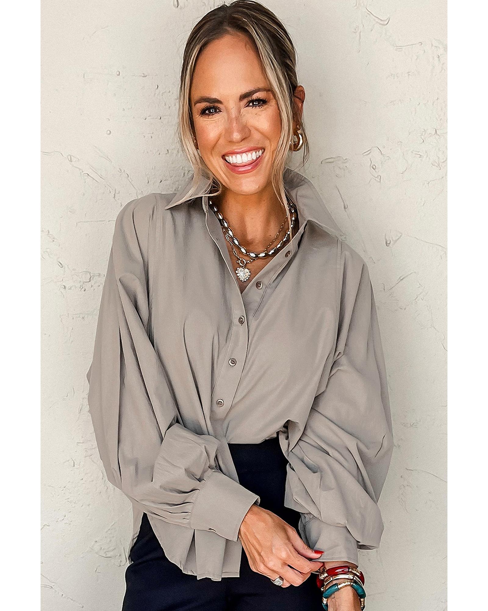 High Solid Color Balloon Sleeve Side Slits Loose Fit Shirt – L