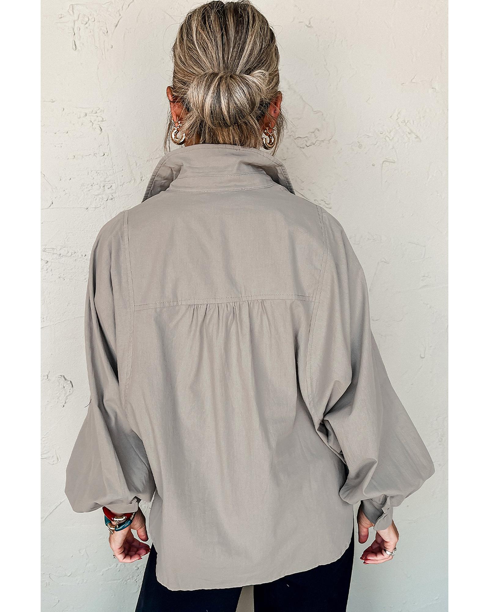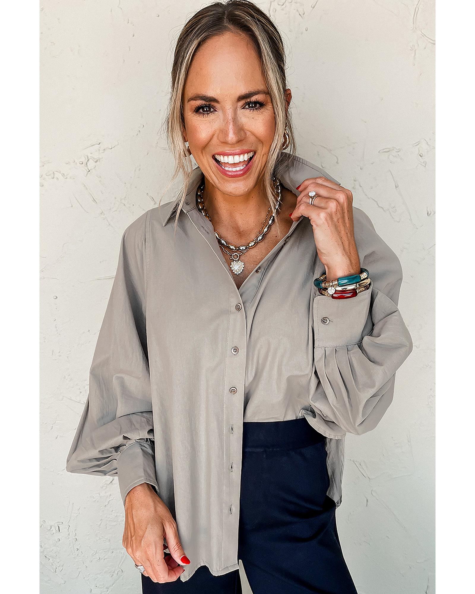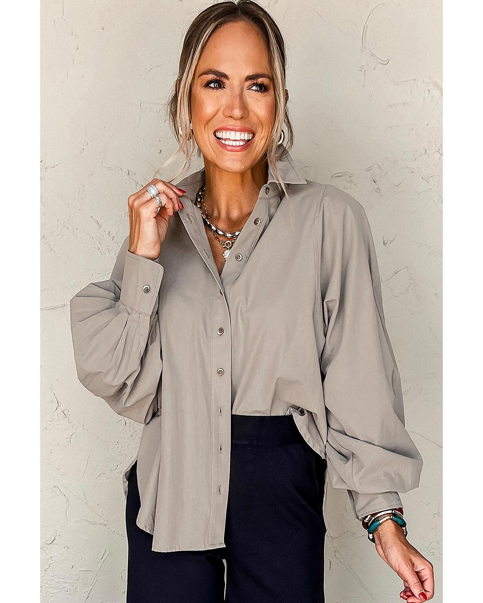 This high solid color balloon sleeve shirt features a loose fit design with stylish side slits, making it a versatile addition to your wardrobe. Its classic collared neckline and trendy balloon sleeves provide a fashionable look suitable for various occasions.