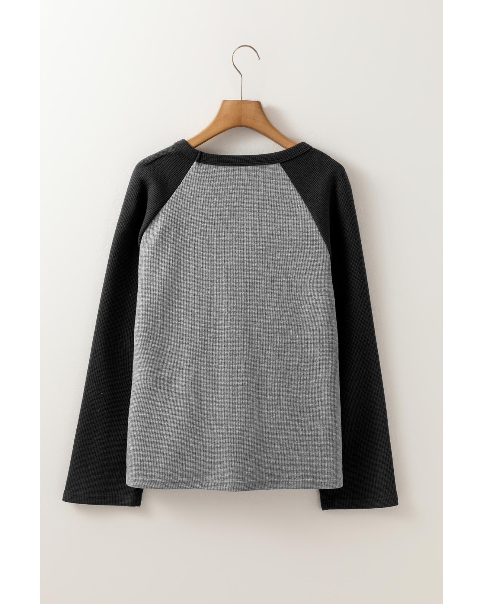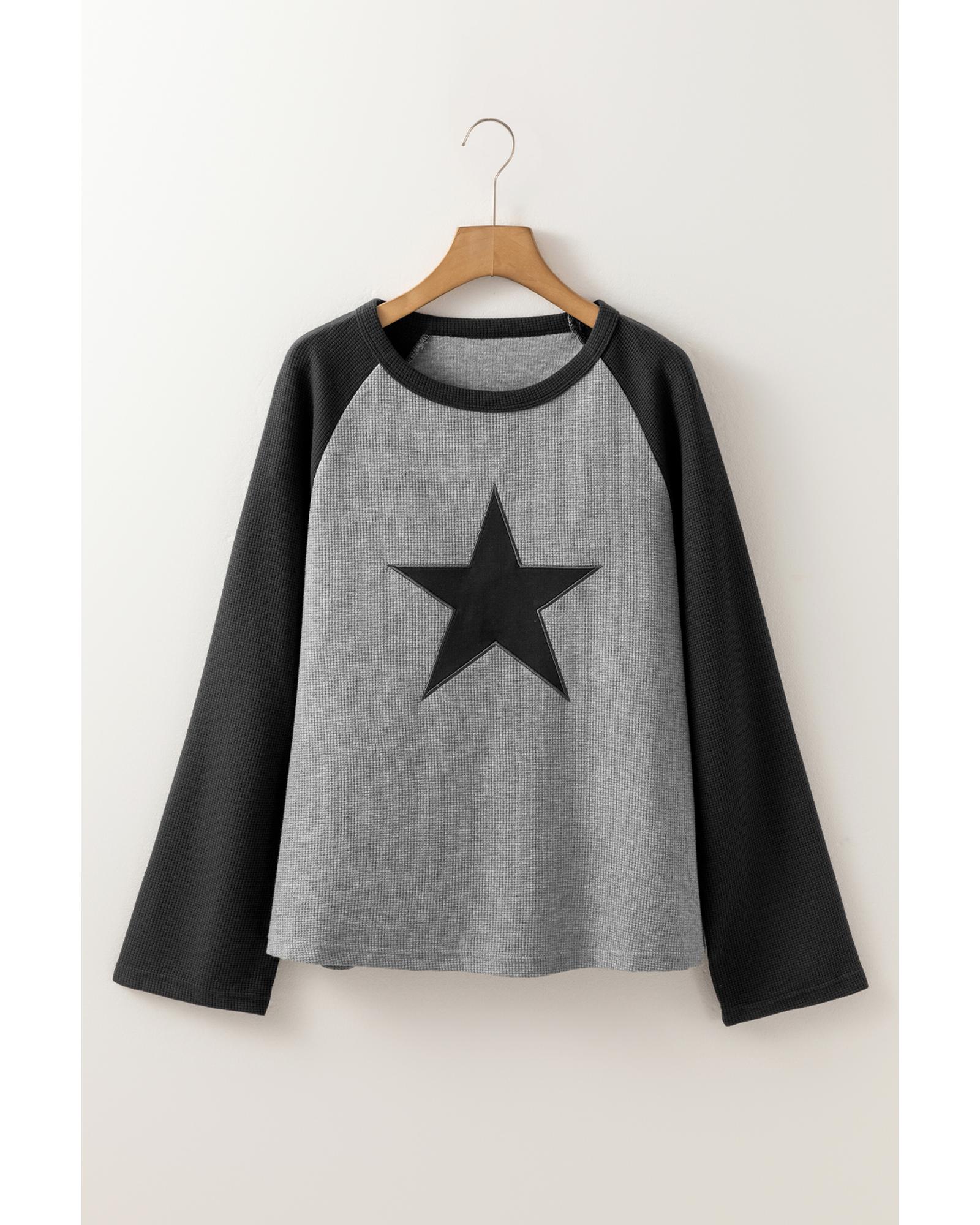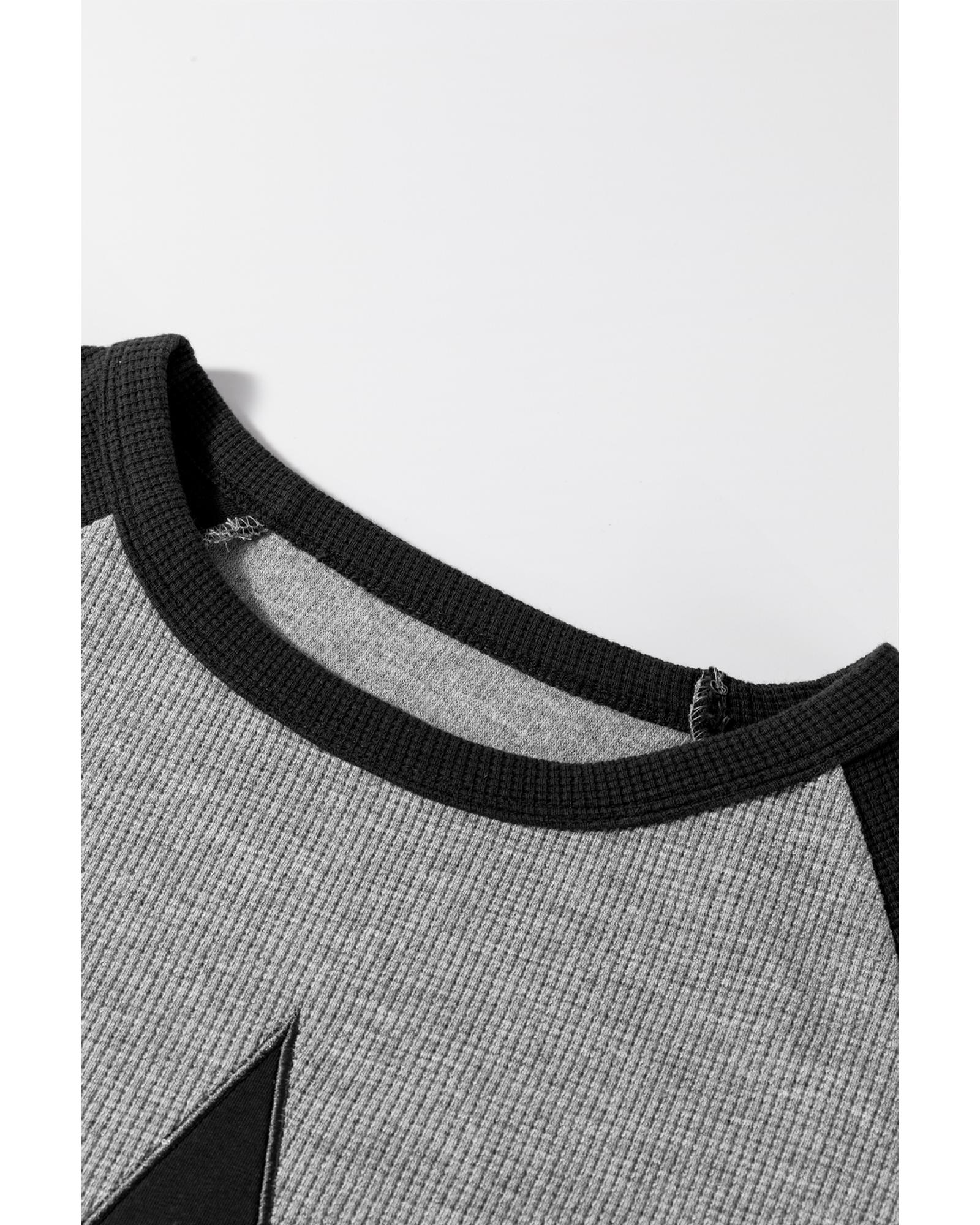 High Waffle Knit Colorblock Star Patch Graphic Raglan Top – L